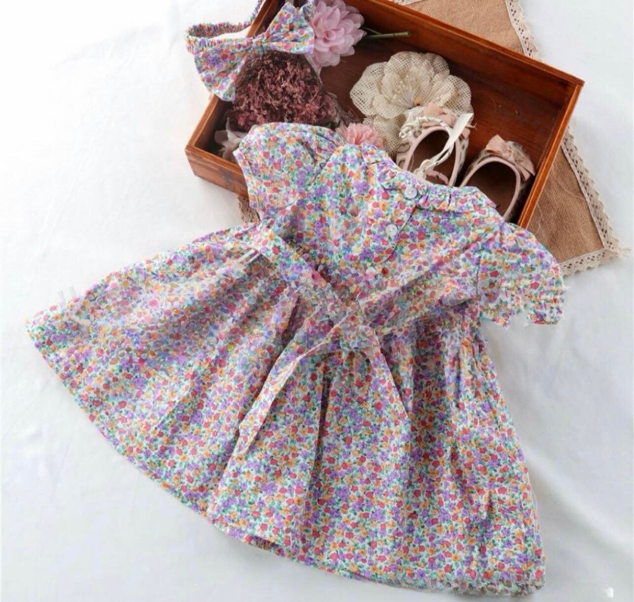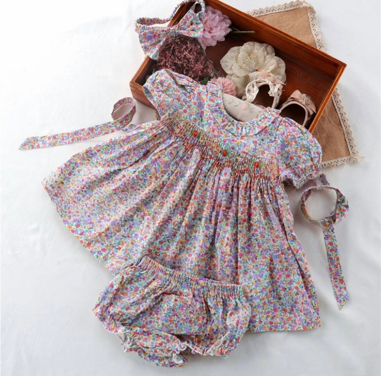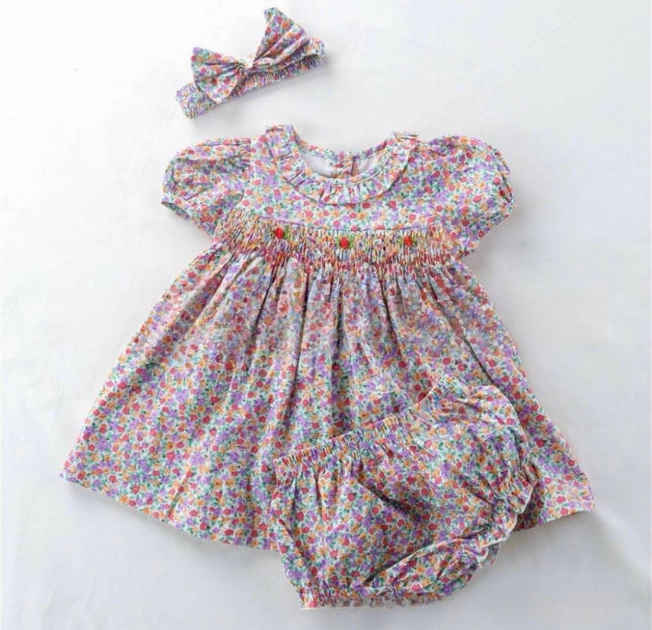 【即納】(80〜100cm) 新作 小花柄 ヘアバンド パンツ付き スモッキング ワンピース