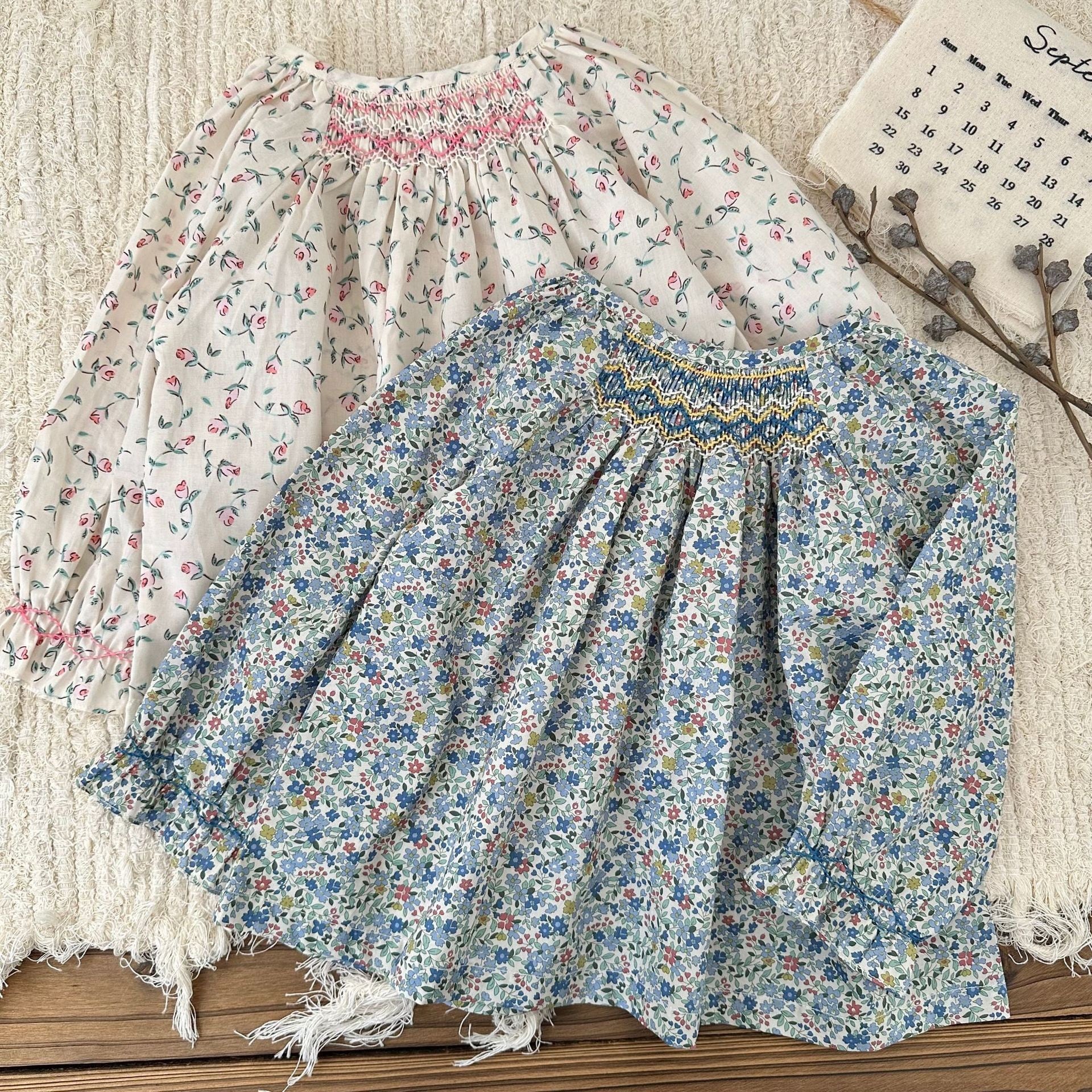 【即納】(80〜130cm) 再入荷 新作 水色 小花柄 スモッキング ブラウス