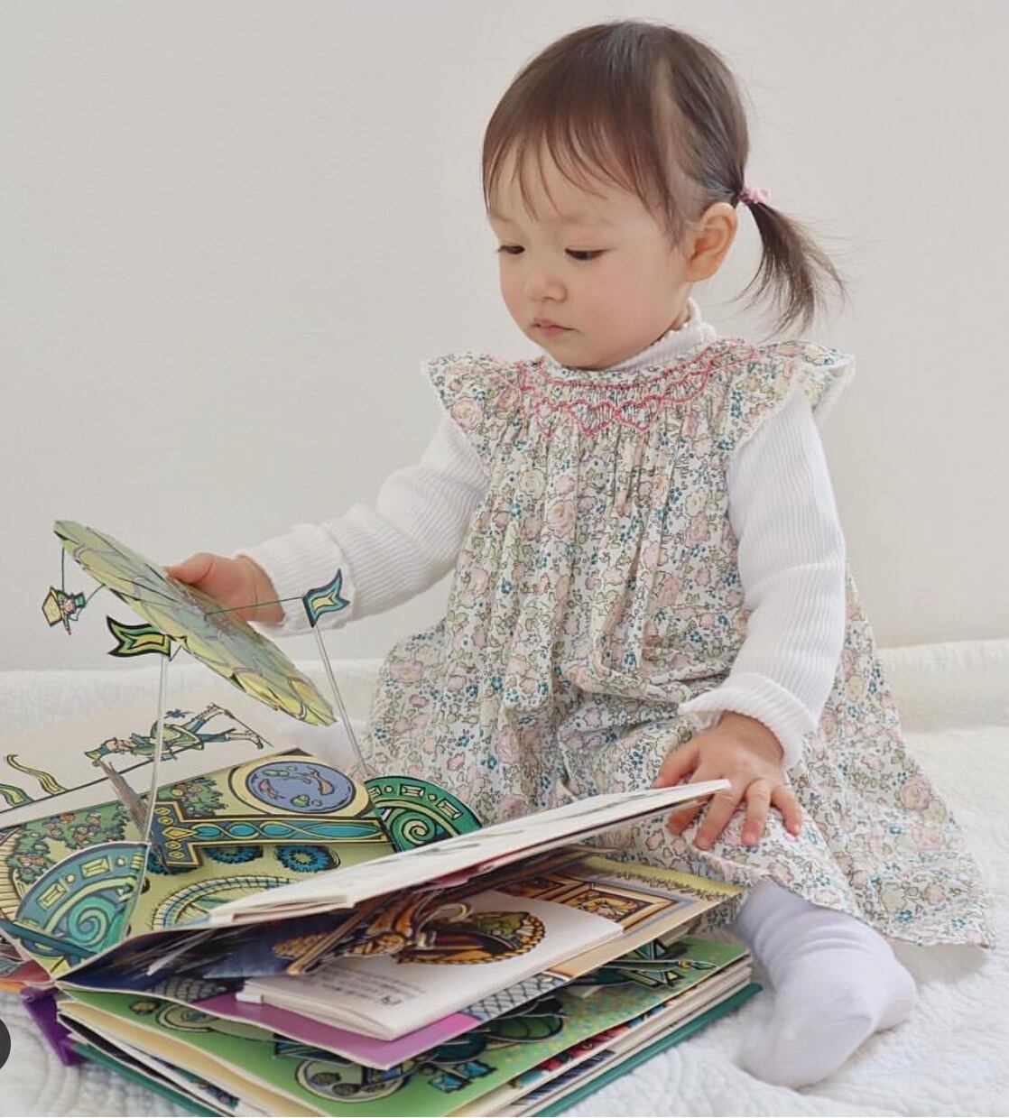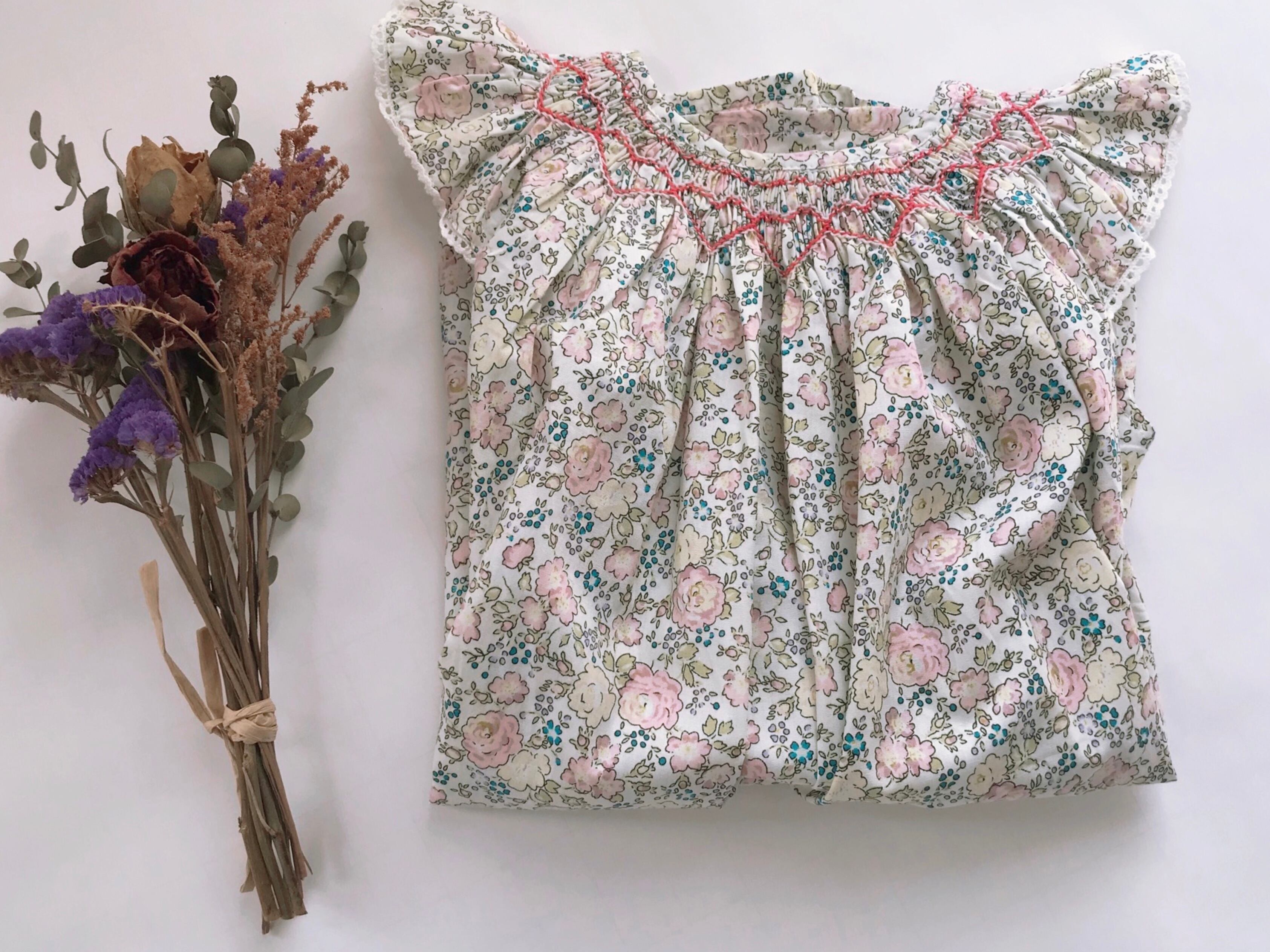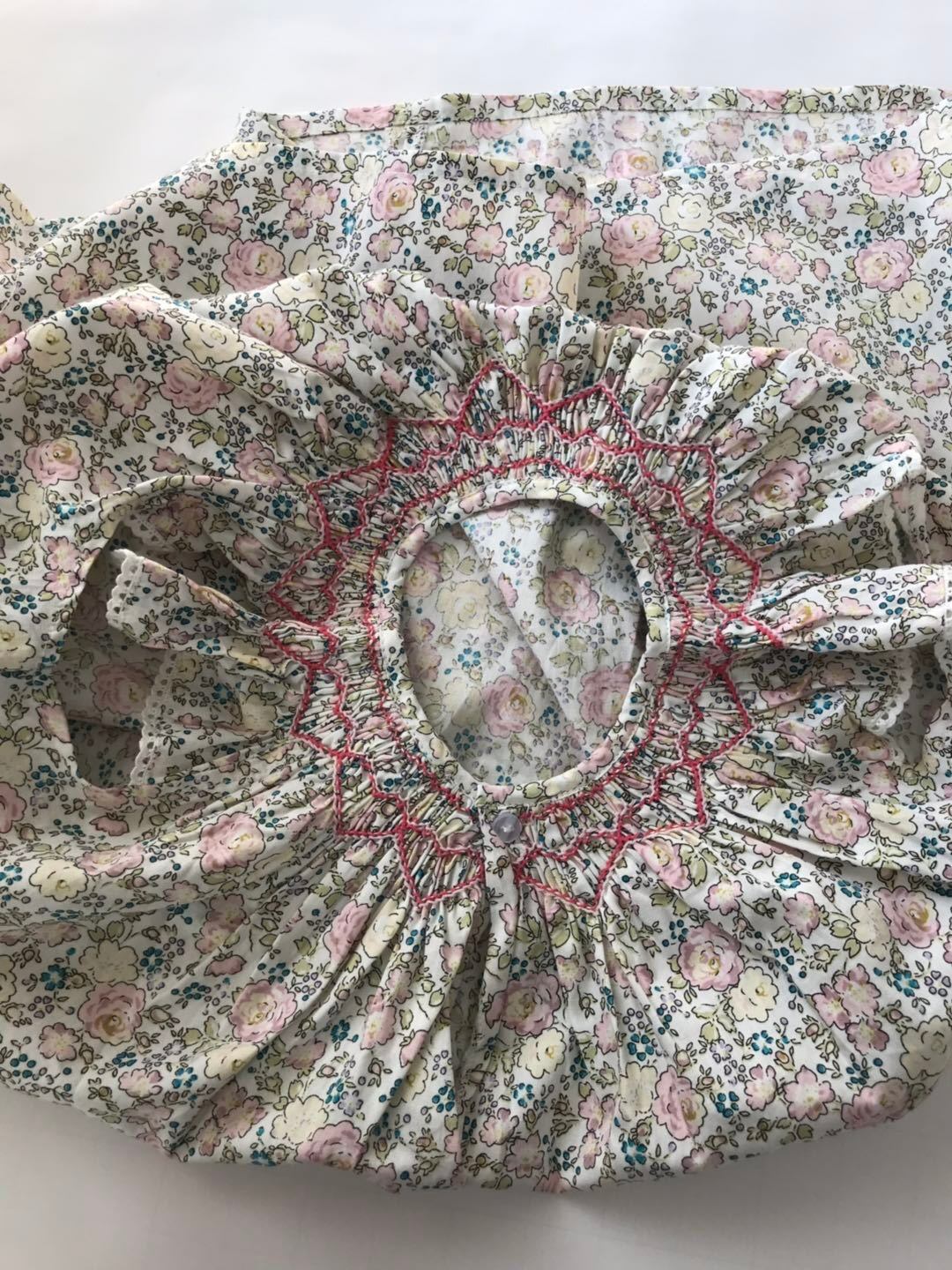 小花柄がとても清楚で可愛いく、スモッキング刺繍もとても素敵です。