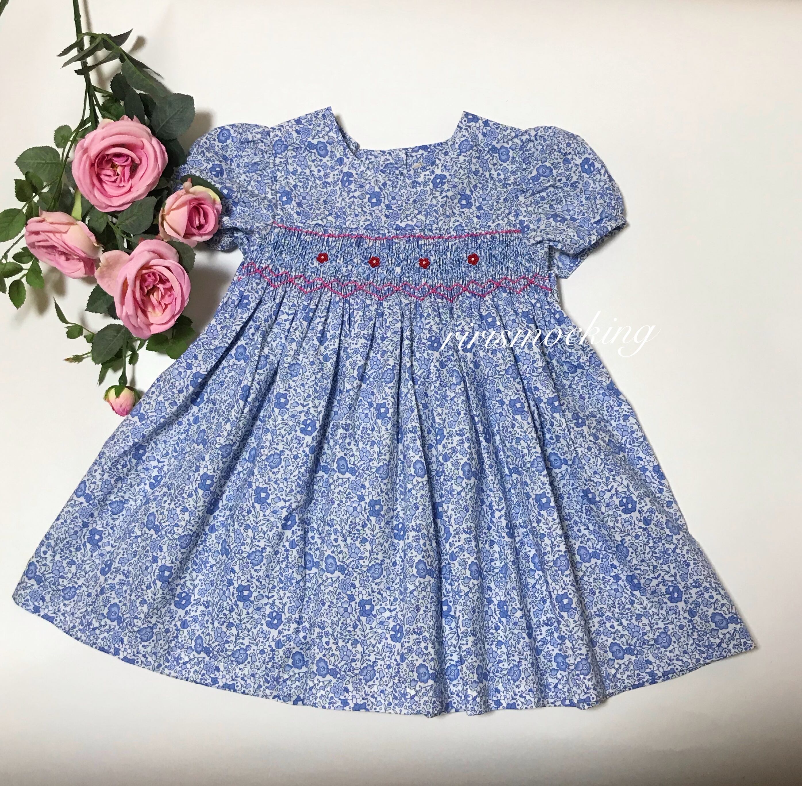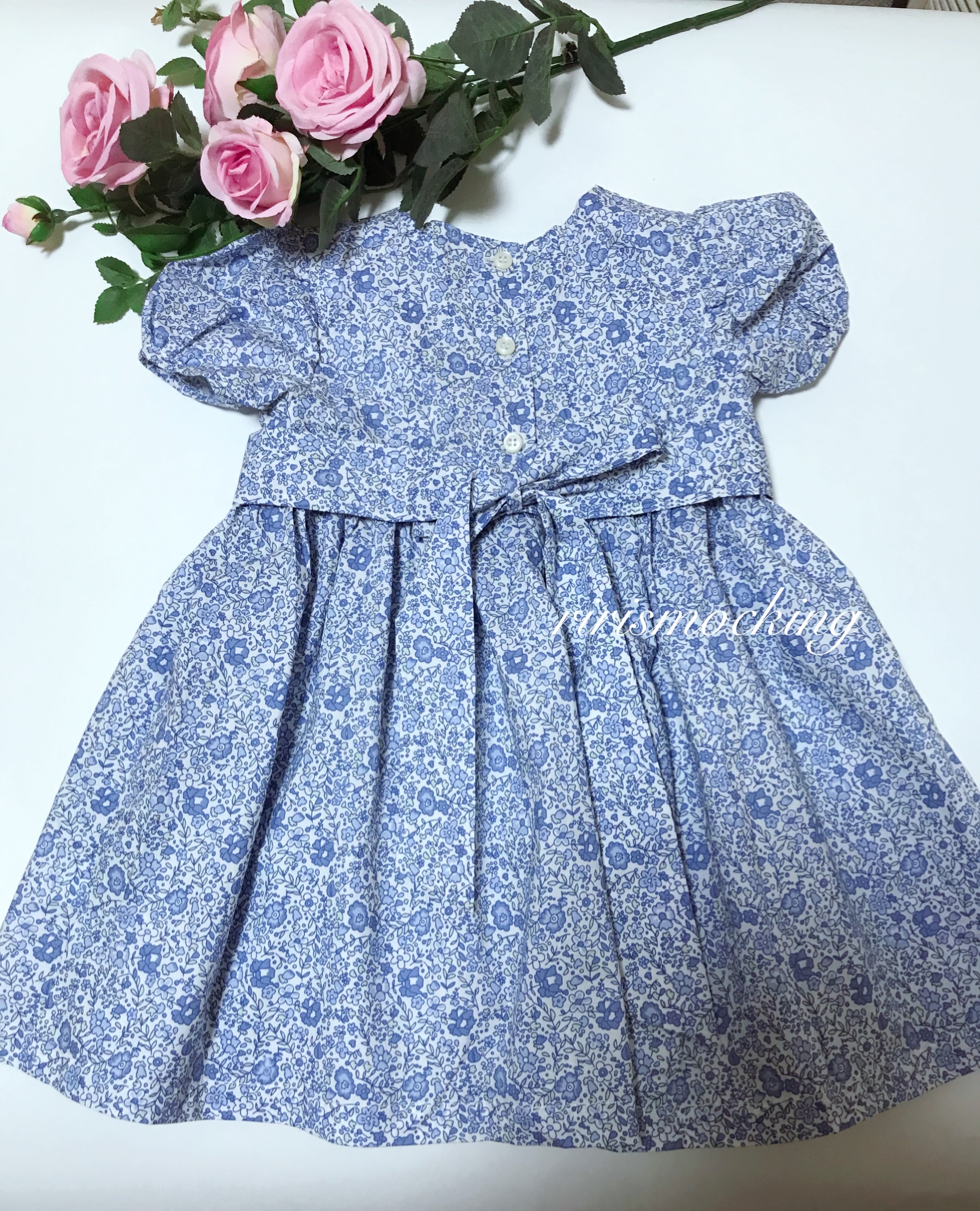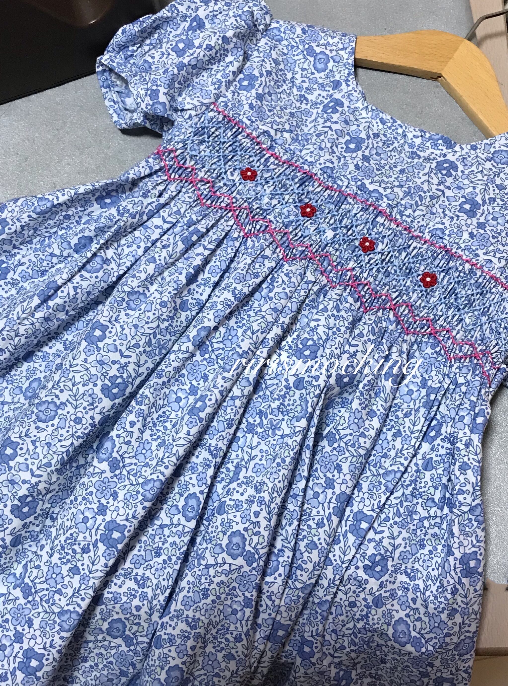 手刺繍のスモッキング刺繍でとても素敵で、ブルー花柄清楚なデザインです。