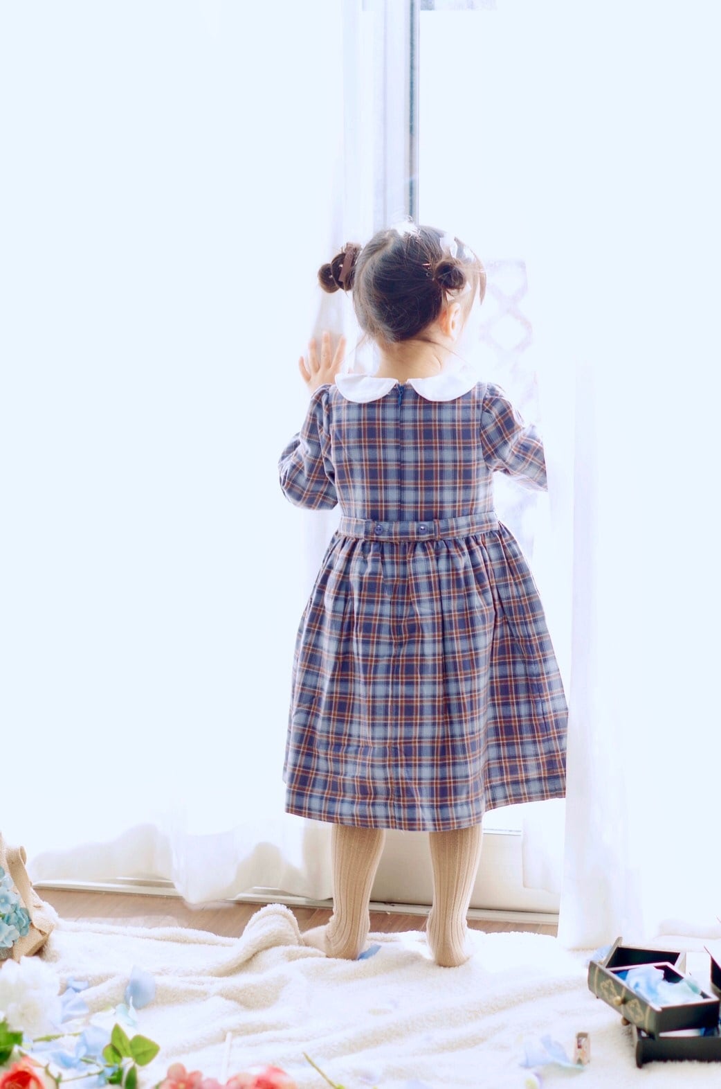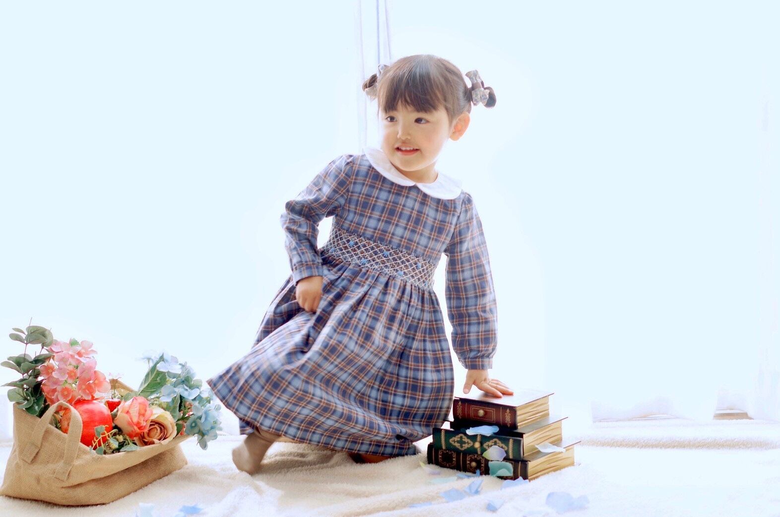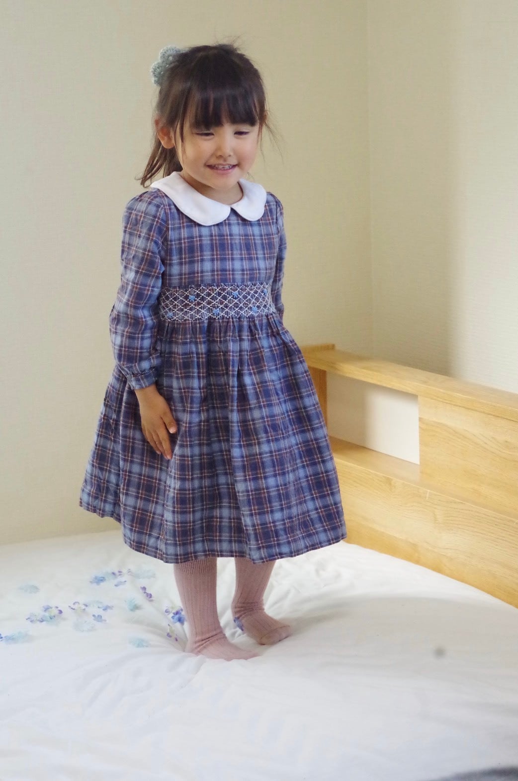 ★新品 ブルーチェック 長袖 スモッキング ワンピース
