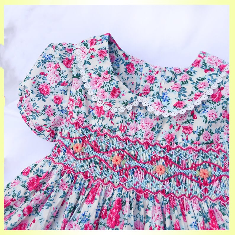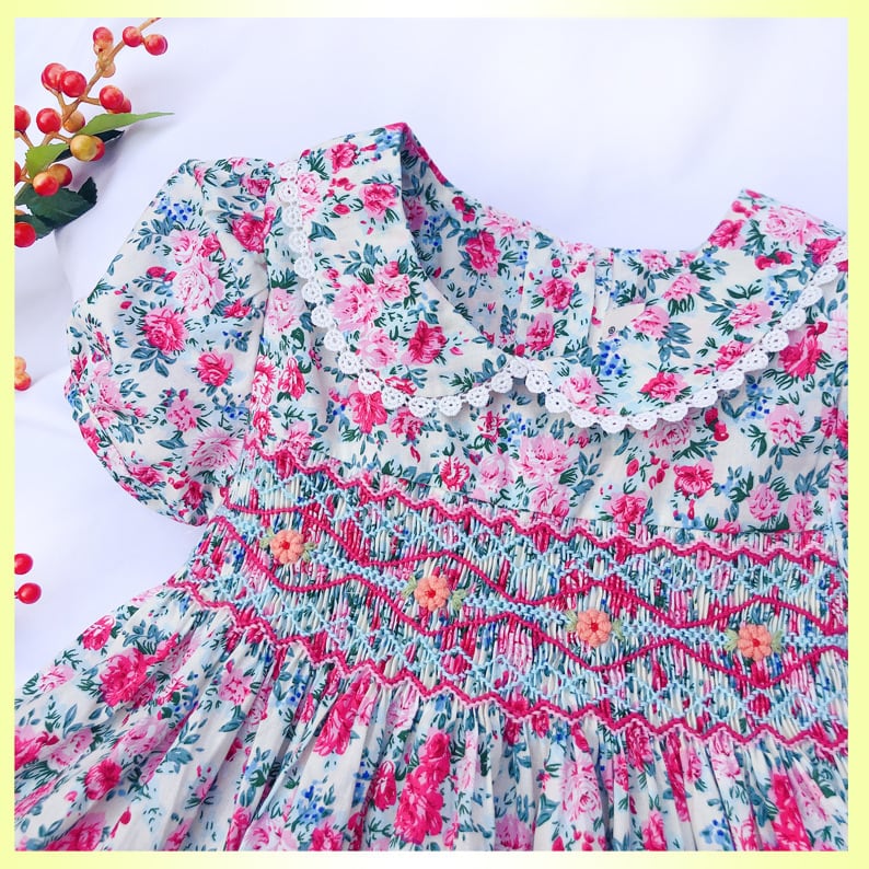 新品 ピンク 薔薇 スモッキング ワンピース