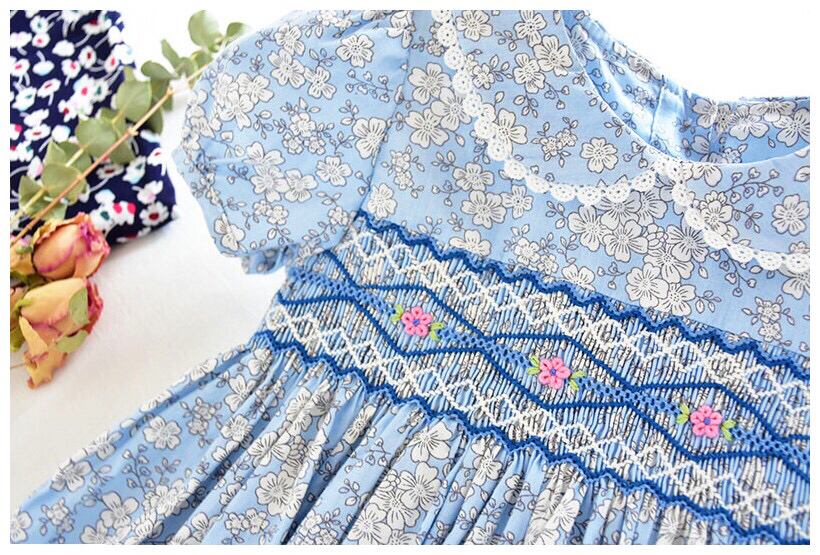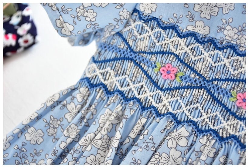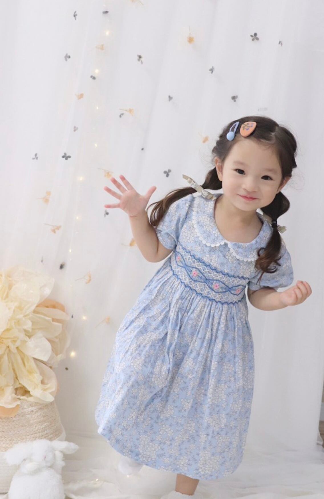 【即納】新作 水色 花柄 スモッキング ワンピース お教室 お習い事 お稽古