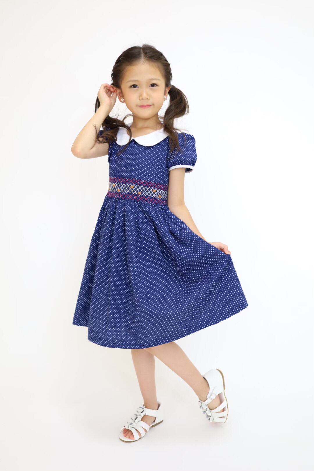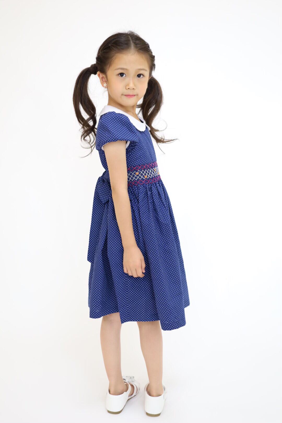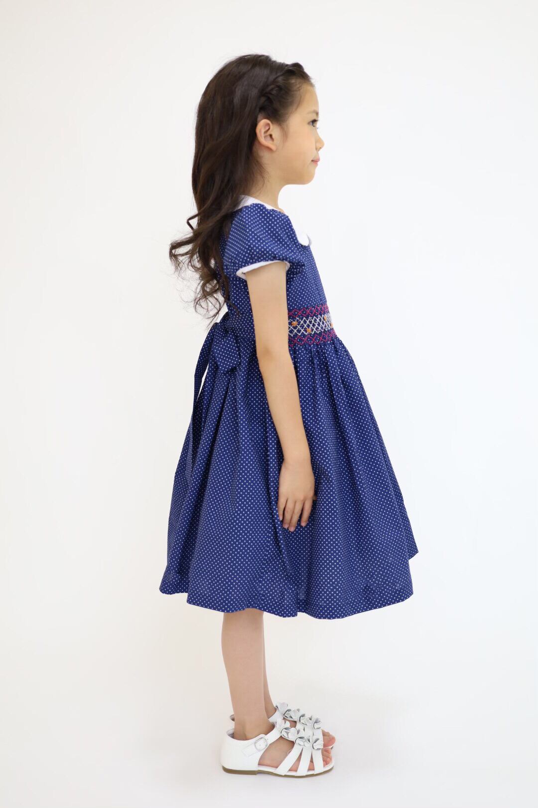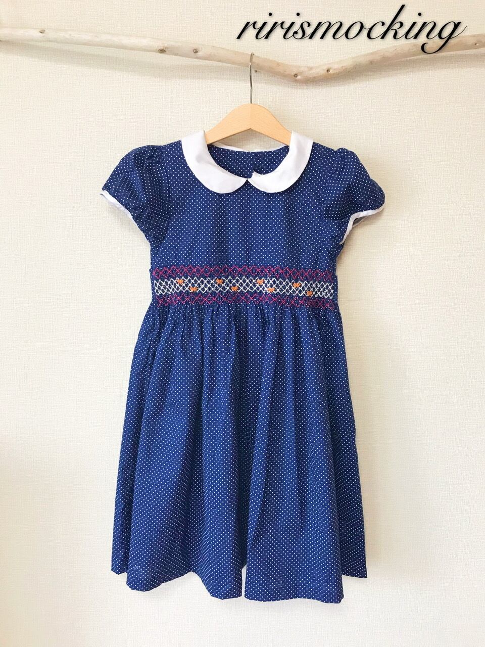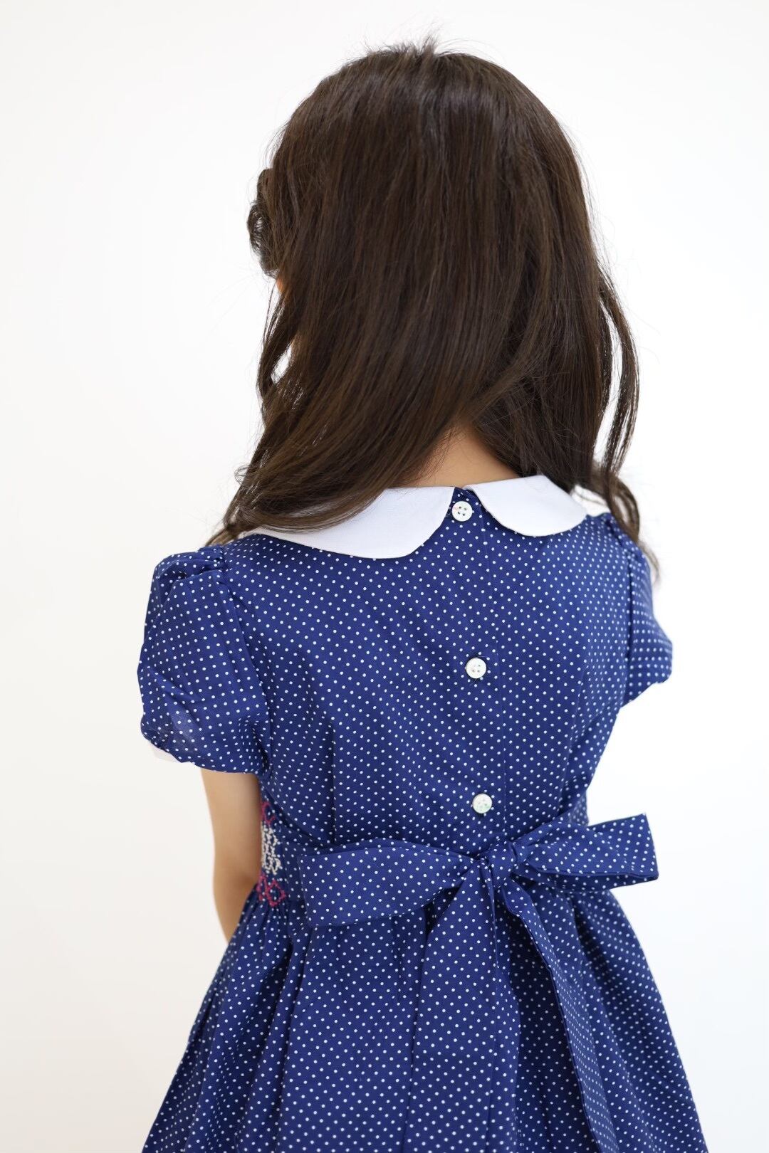 ★新品 白襟 ネイビー ドット スモッキング ワンピース