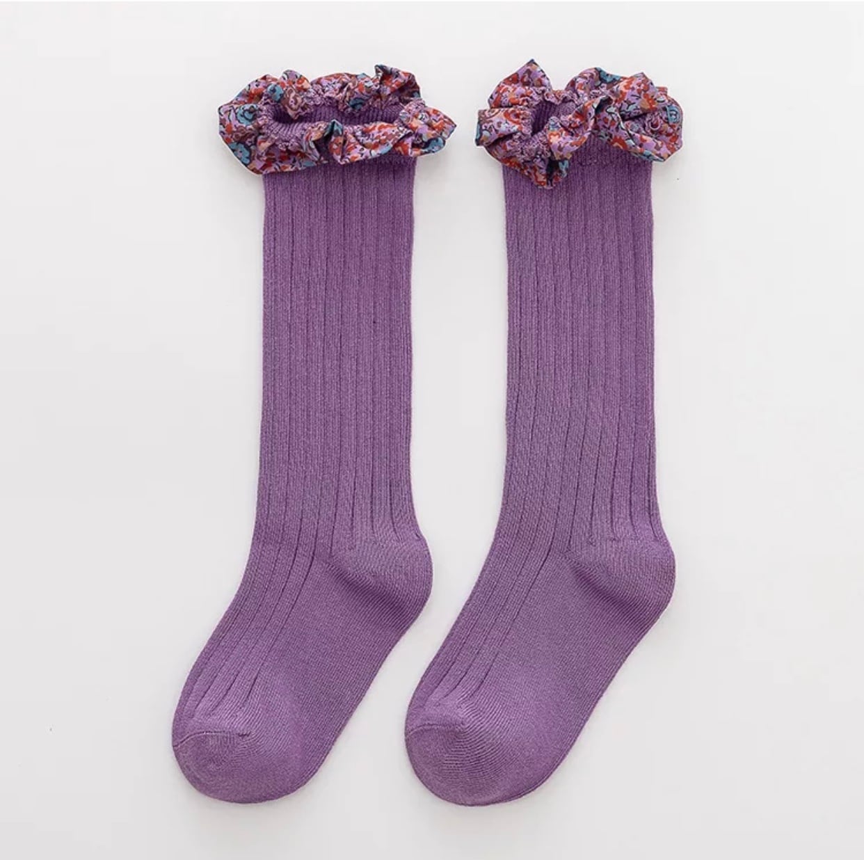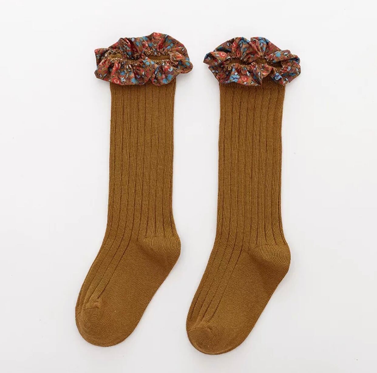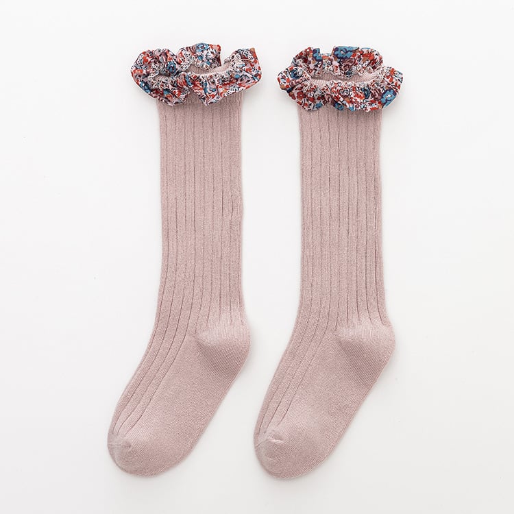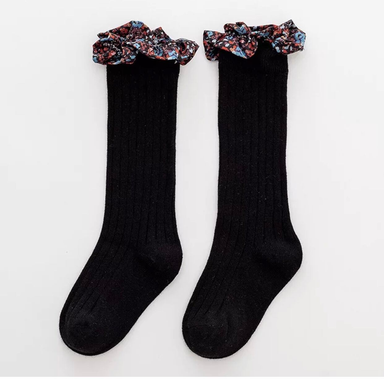 【即納】再入荷小花柄フリル付き ハイソックス 0〜8歳 くすみピンク マスタード ブラック ブルー アイボリー