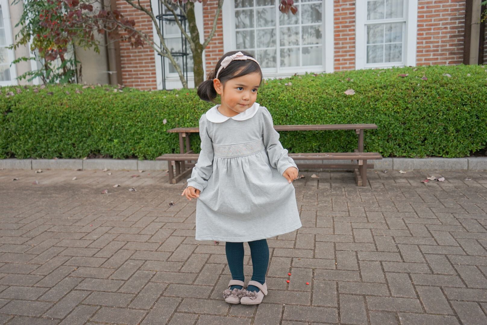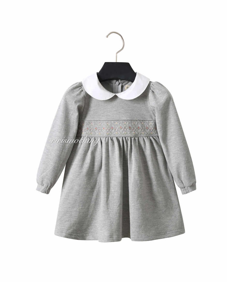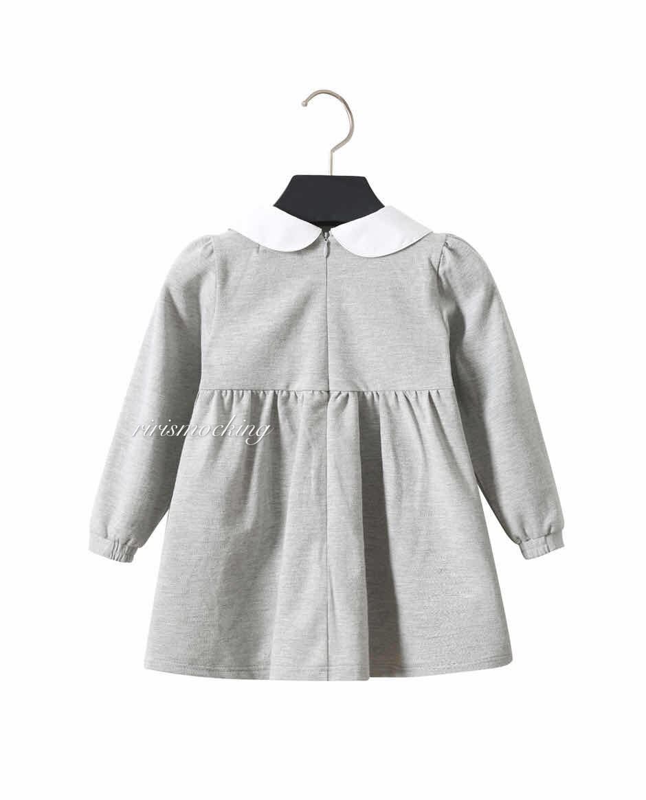 【即納】(85〜130cm)グレー 花刺繍 鹿の子 長袖 ワンピース 1歳 2歳 3歳 4歳 5歳 6歳