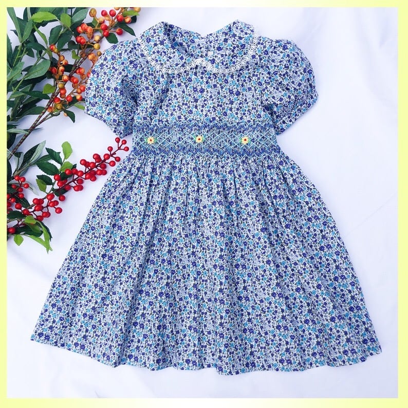 【即納】新作 ブルー 小花柄 スモッキング ワンピース 95 100 110 120 130 140