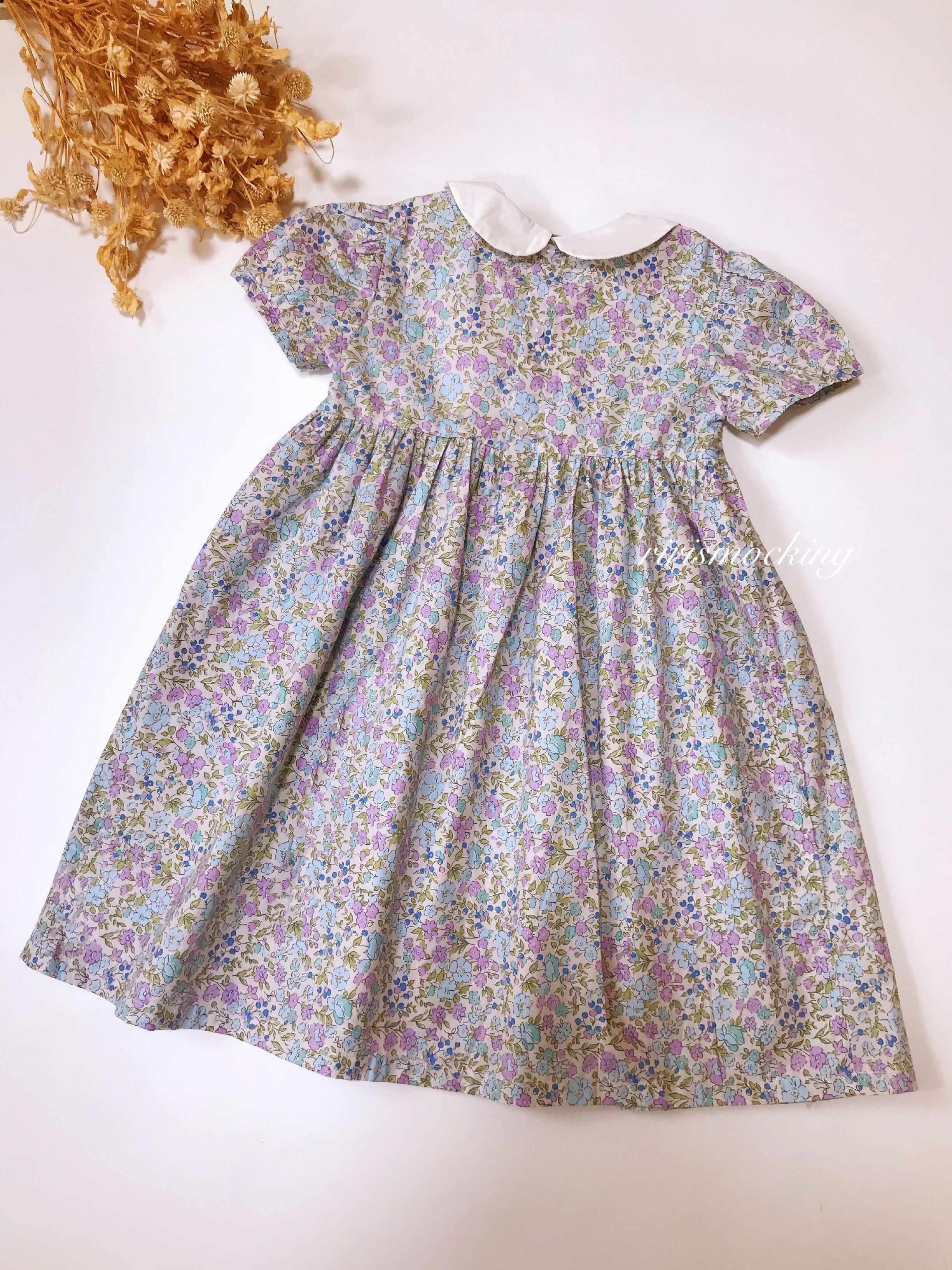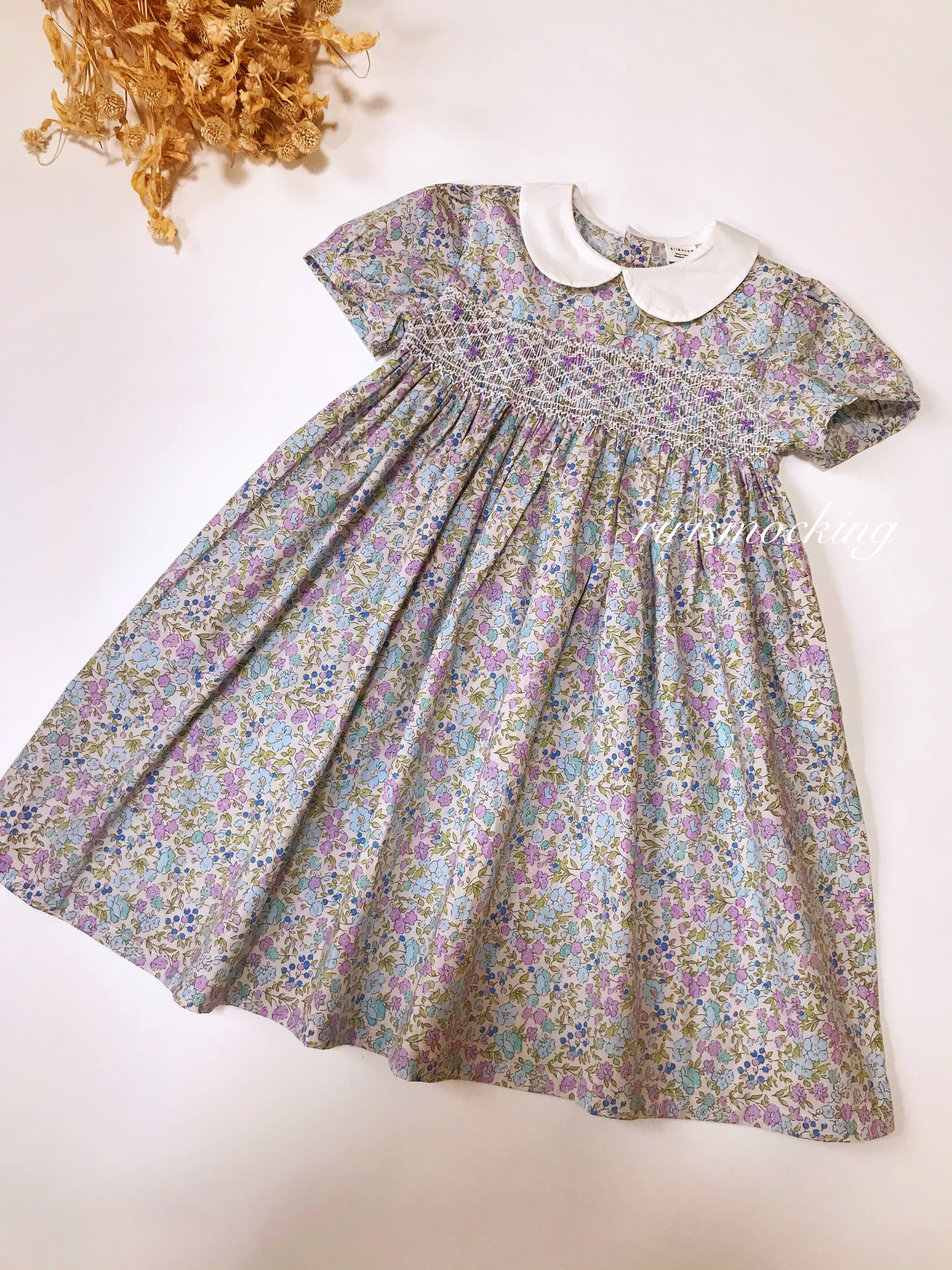 【即納】(90〜140cm)紫 小花柄 リボン スモッキング ワンピース 90 100 110 120 130 140
