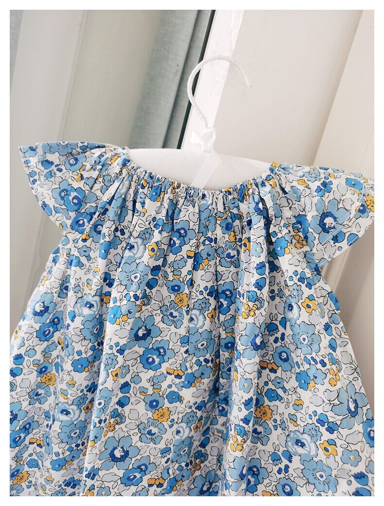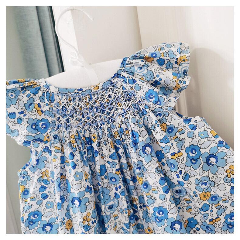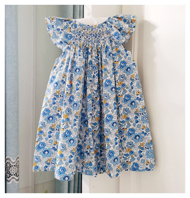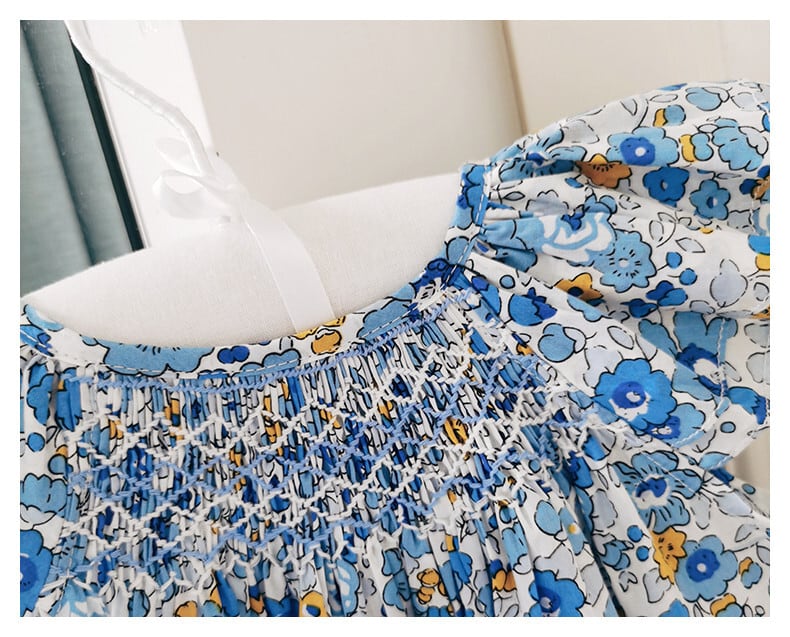 ★ブルー小花柄可愛いく、スモッキング刺繍もとても素敵です。