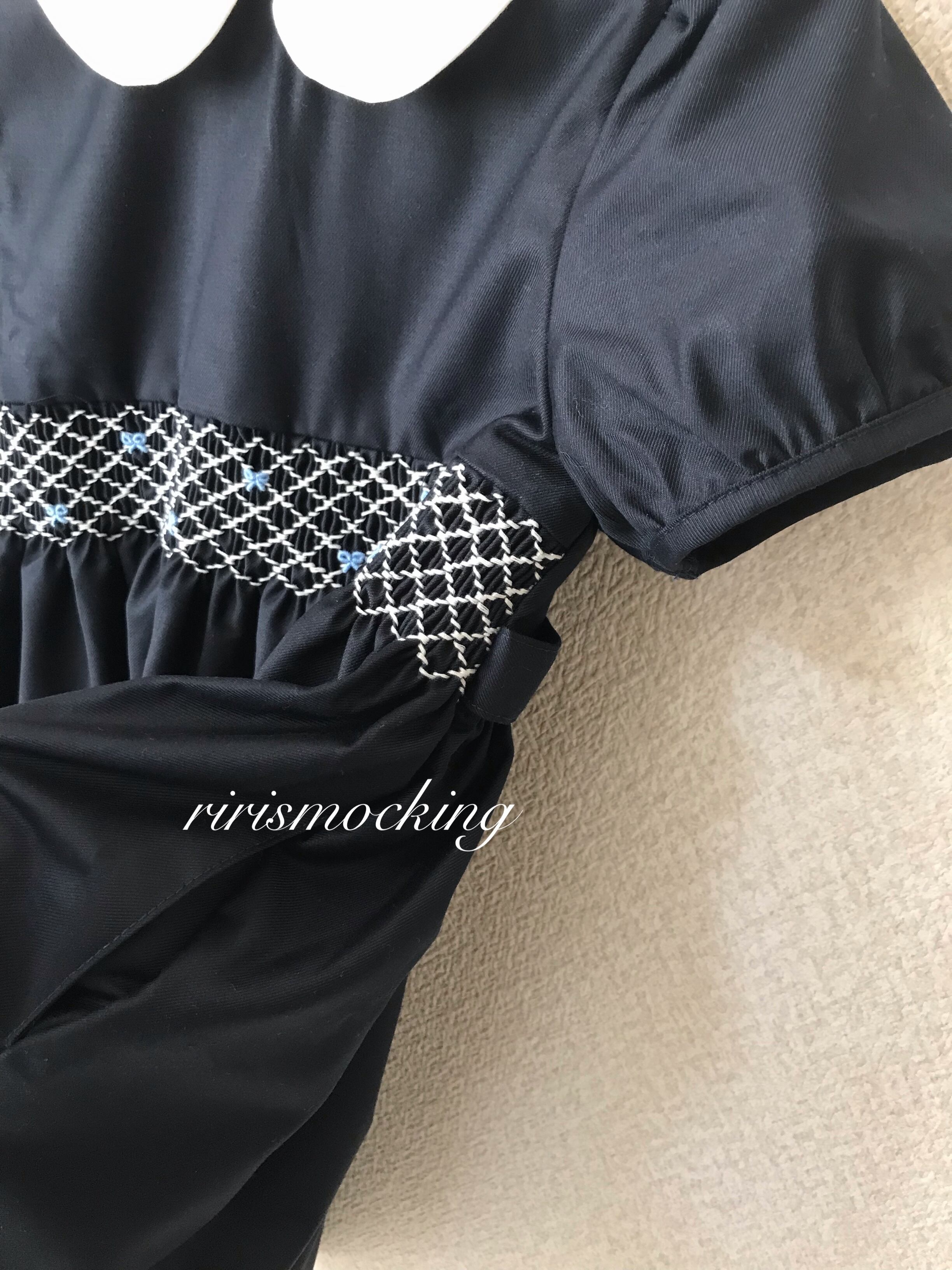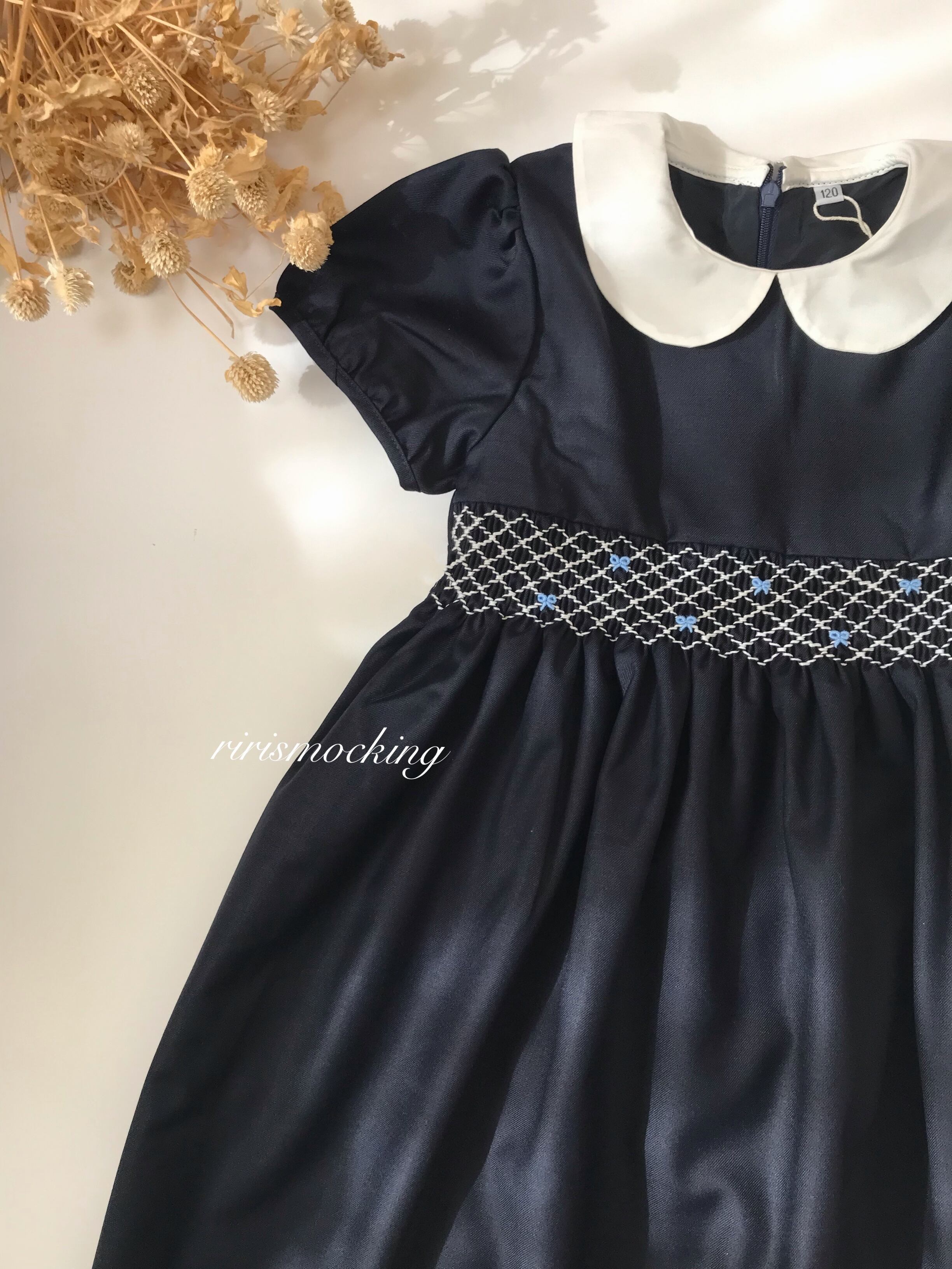 新品 秋 冬 春 半袖 ネイビー 濃紺 リボン スモッキング 半袖 ワンピース