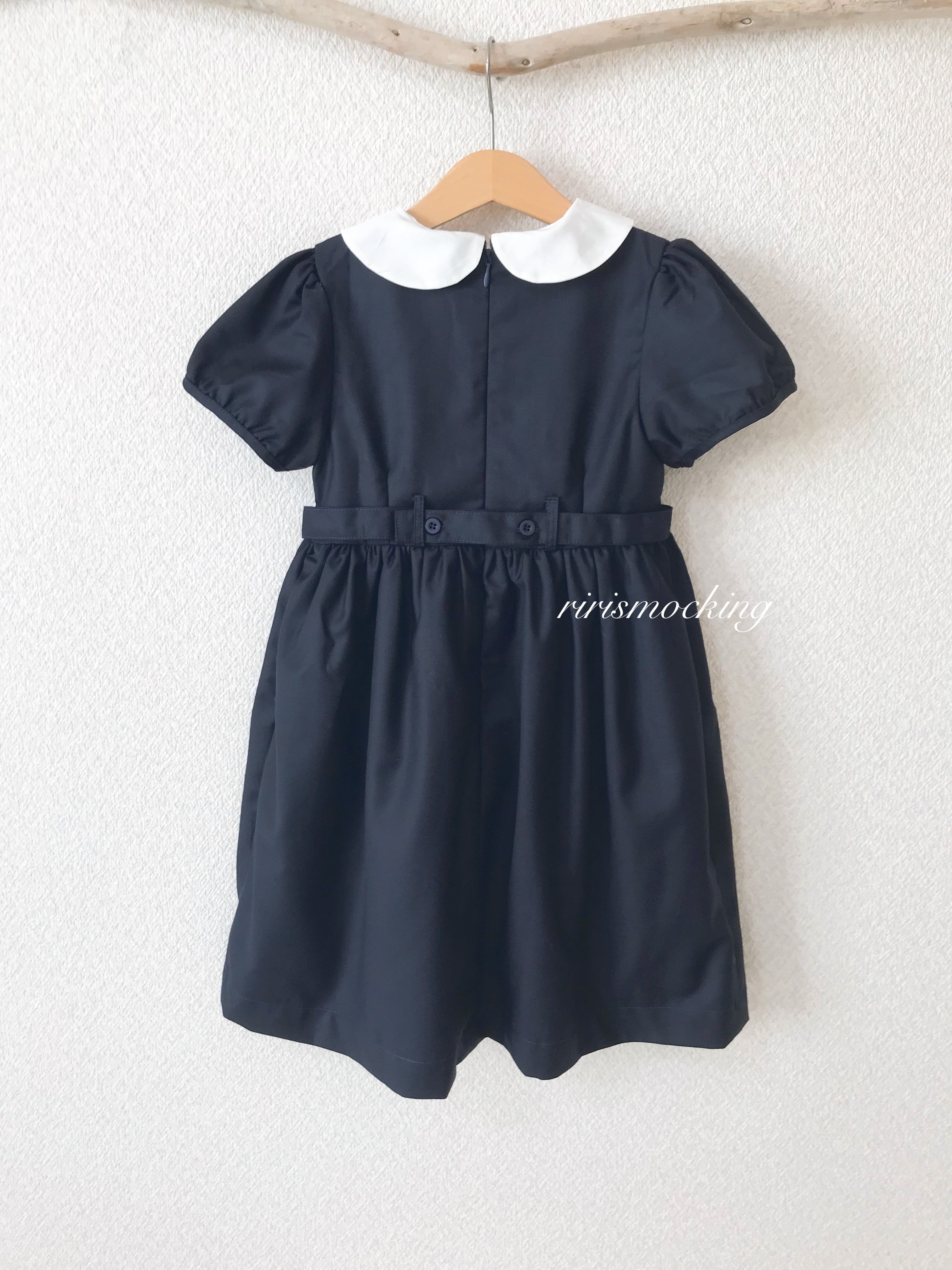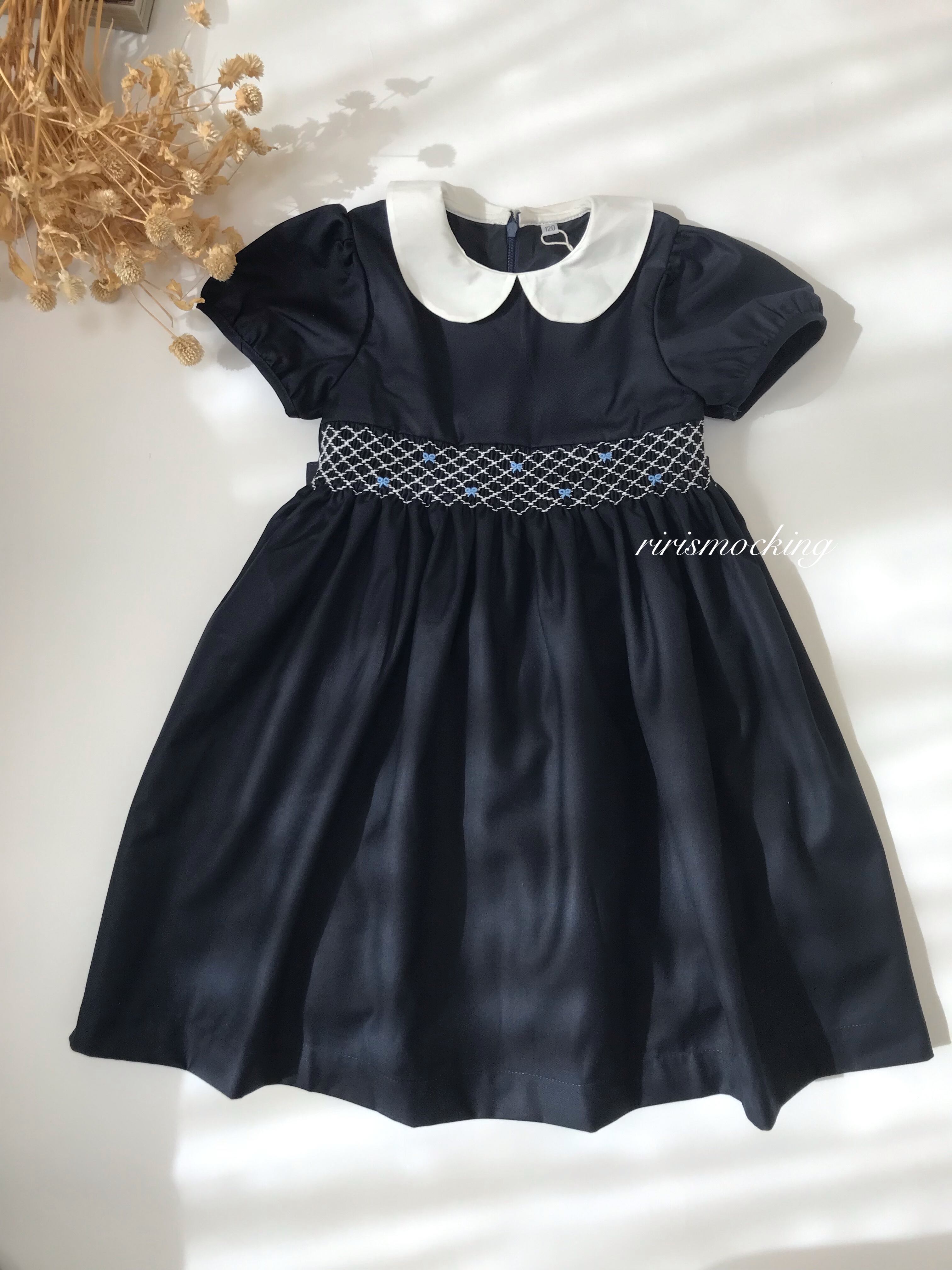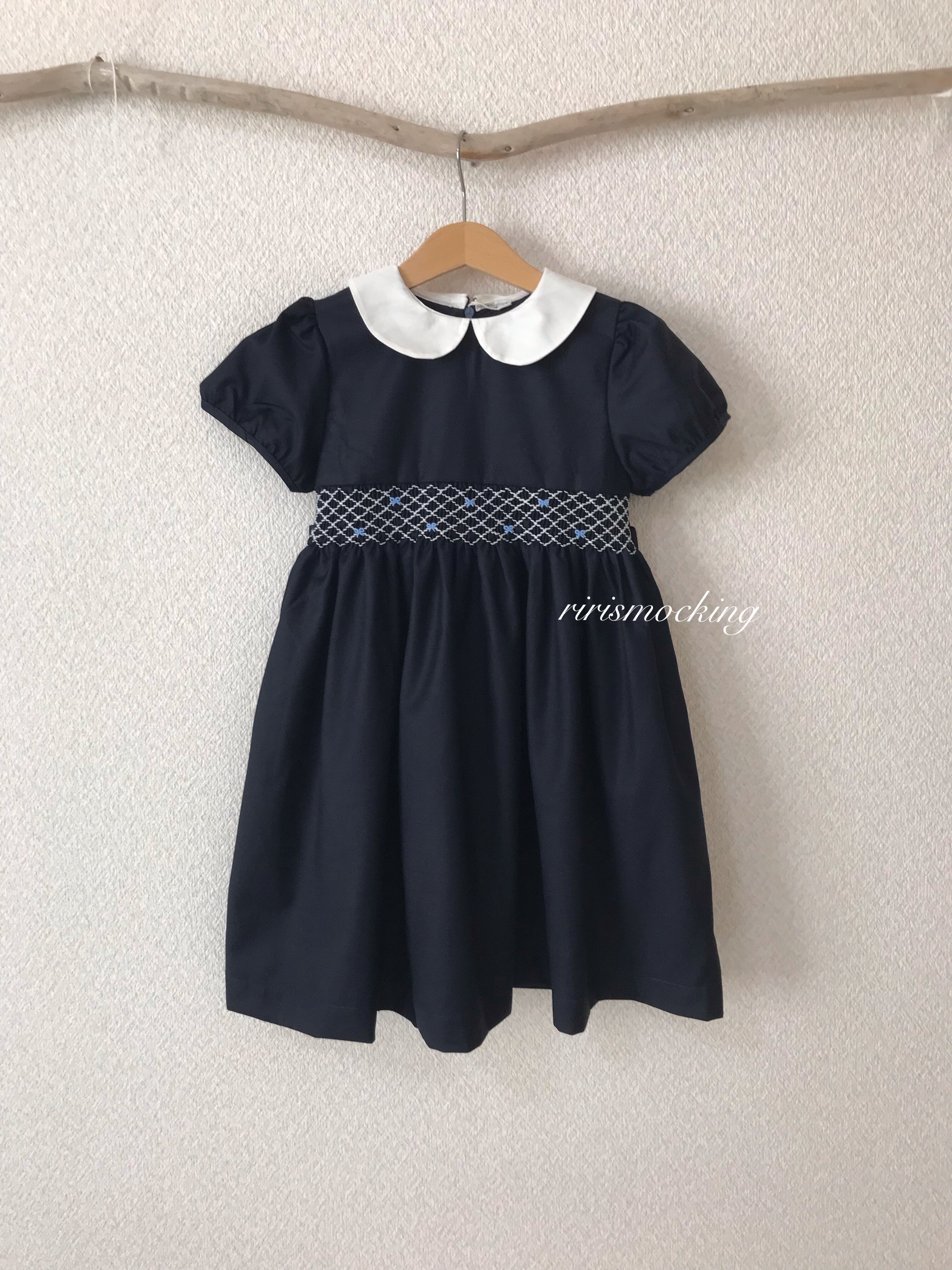 【即納】(90〜130cm) 定番 秋冬春 濃紺 半袖 スモッキング ワンピース 七五三