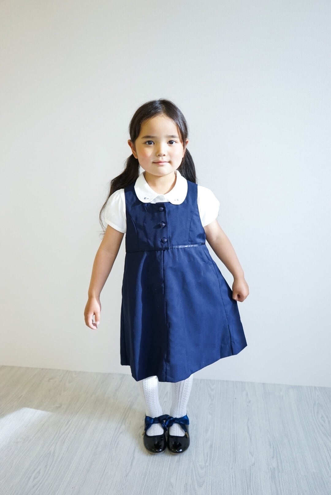 前ボタンはお子さまが一人でもお着替えしやすいのはもちろん、きちんとさがより印象付き、清楚さを引き立てます。