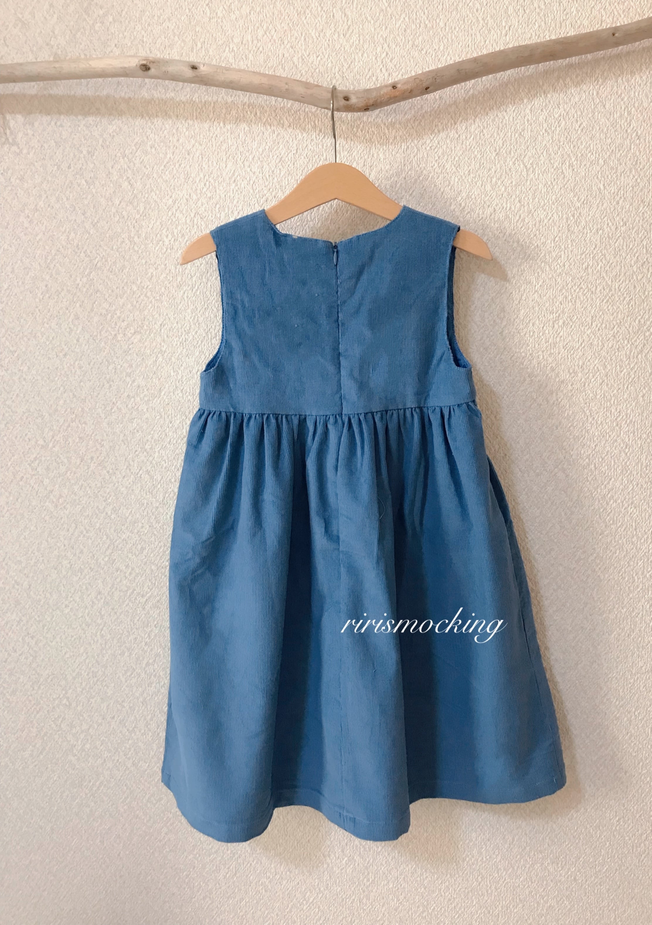 ★新品 ブルー コーデュロイ スモッキング 刺繍 ジャンパースカート