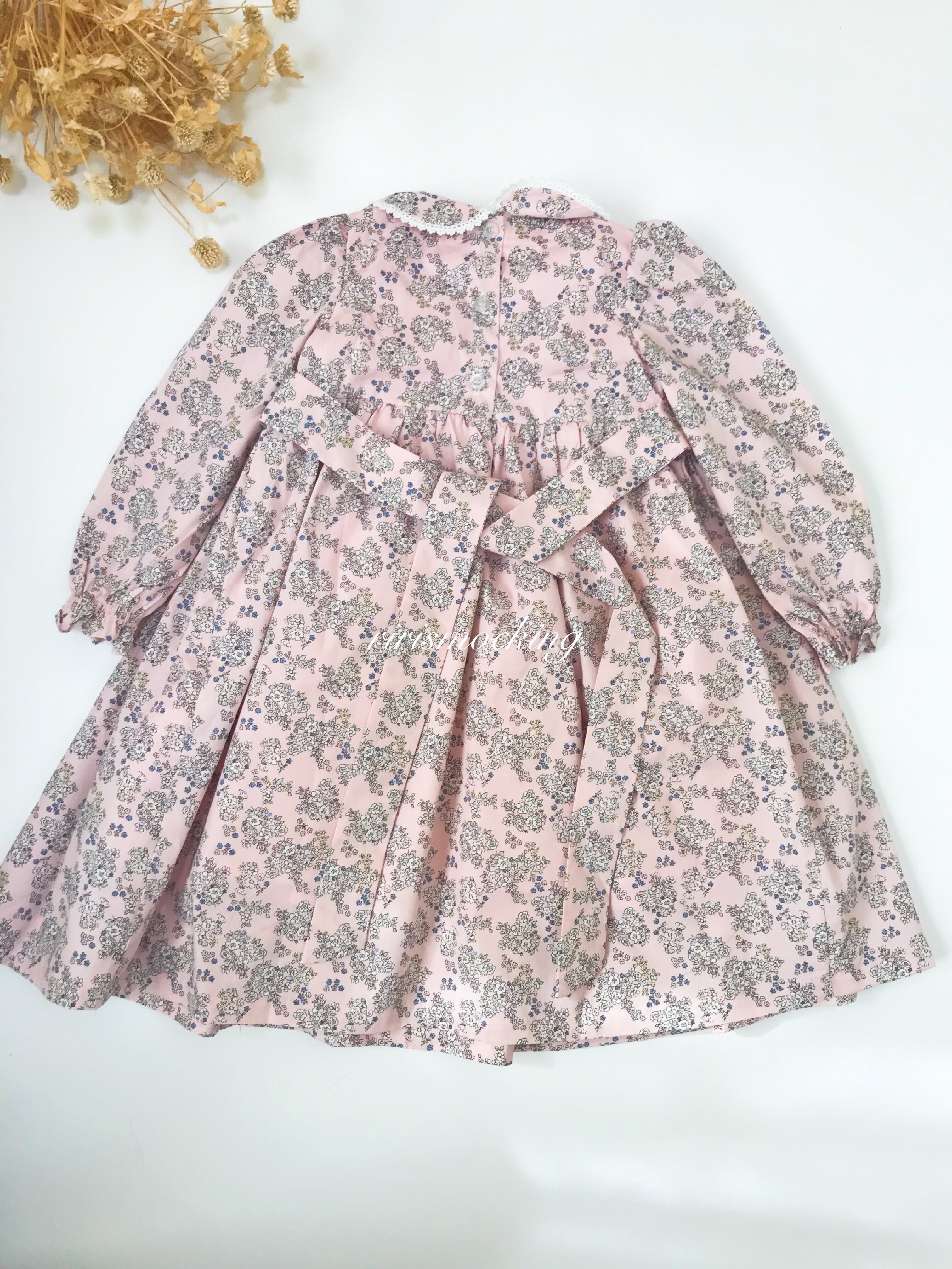 新品 襟付き 長袖 紫 小花柄 スモッキング ワンピース