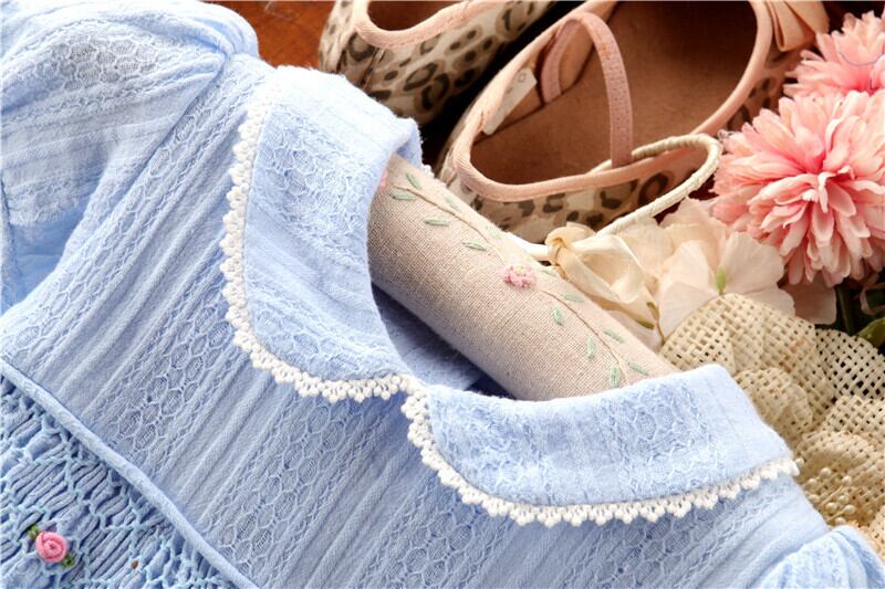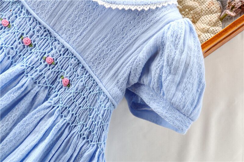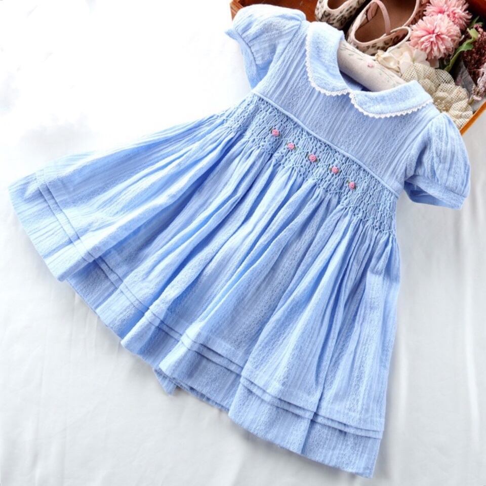 【即納】(85〜125cm)新作 水色 半袖 スモッキング ワンピース