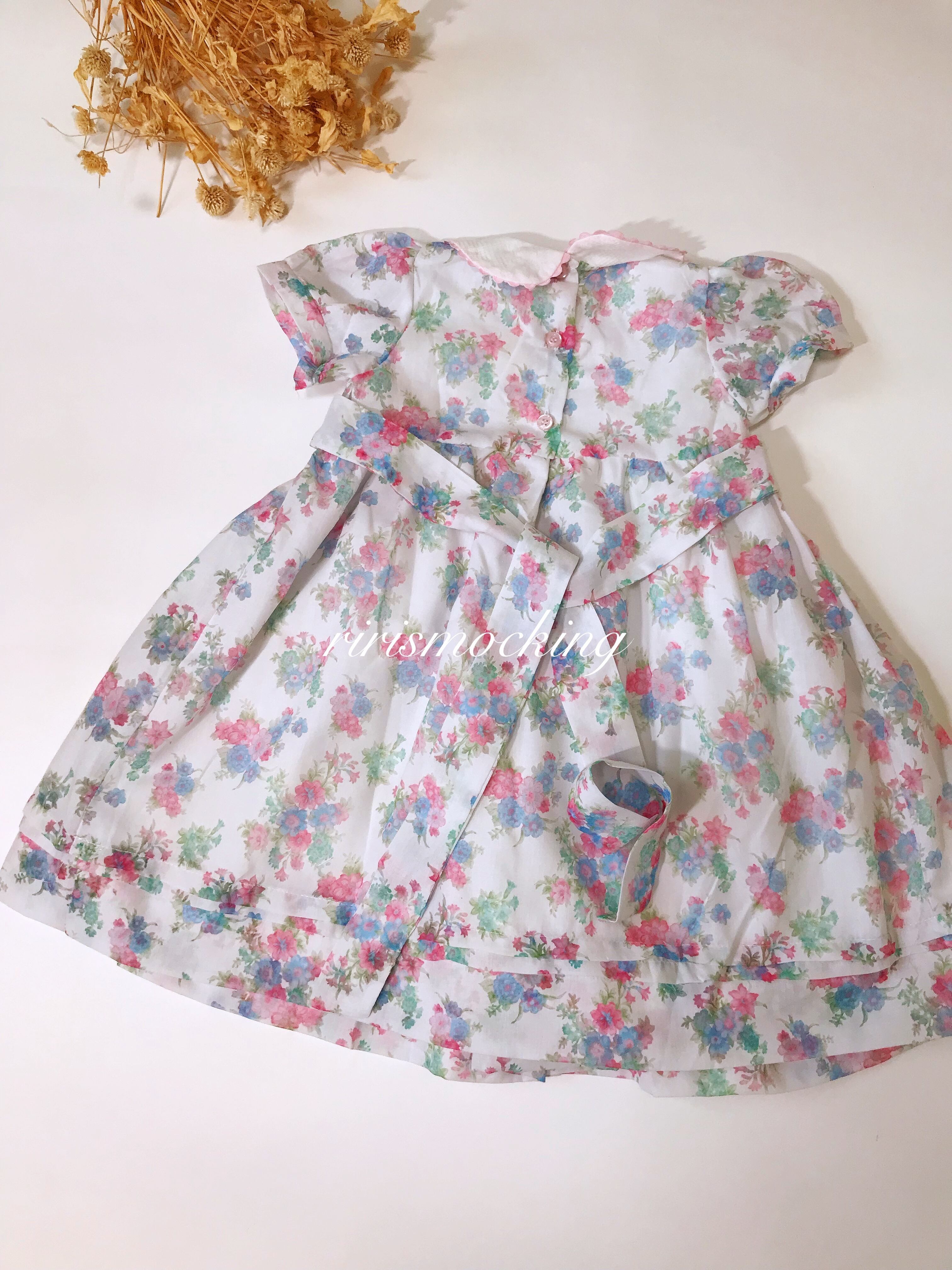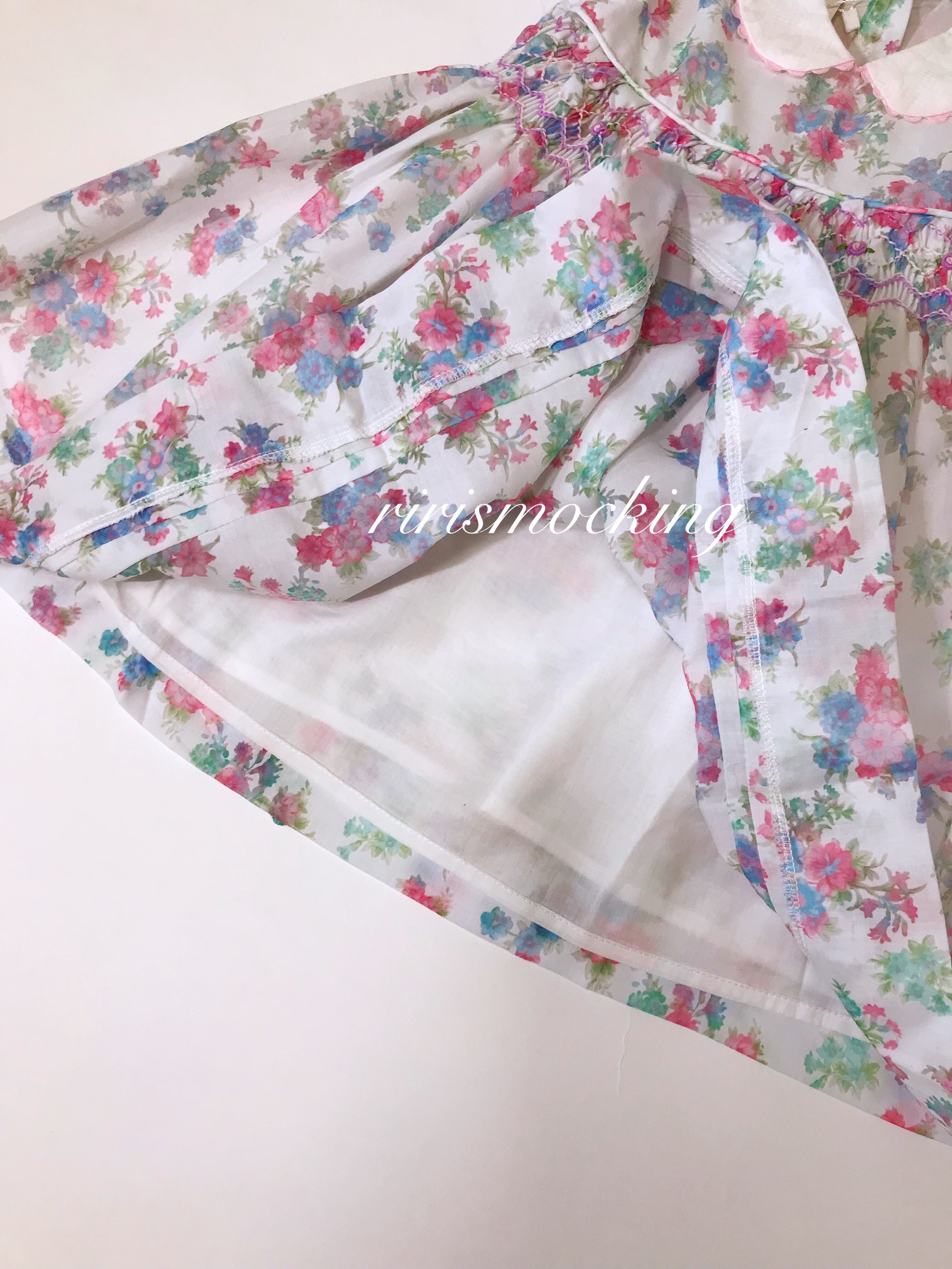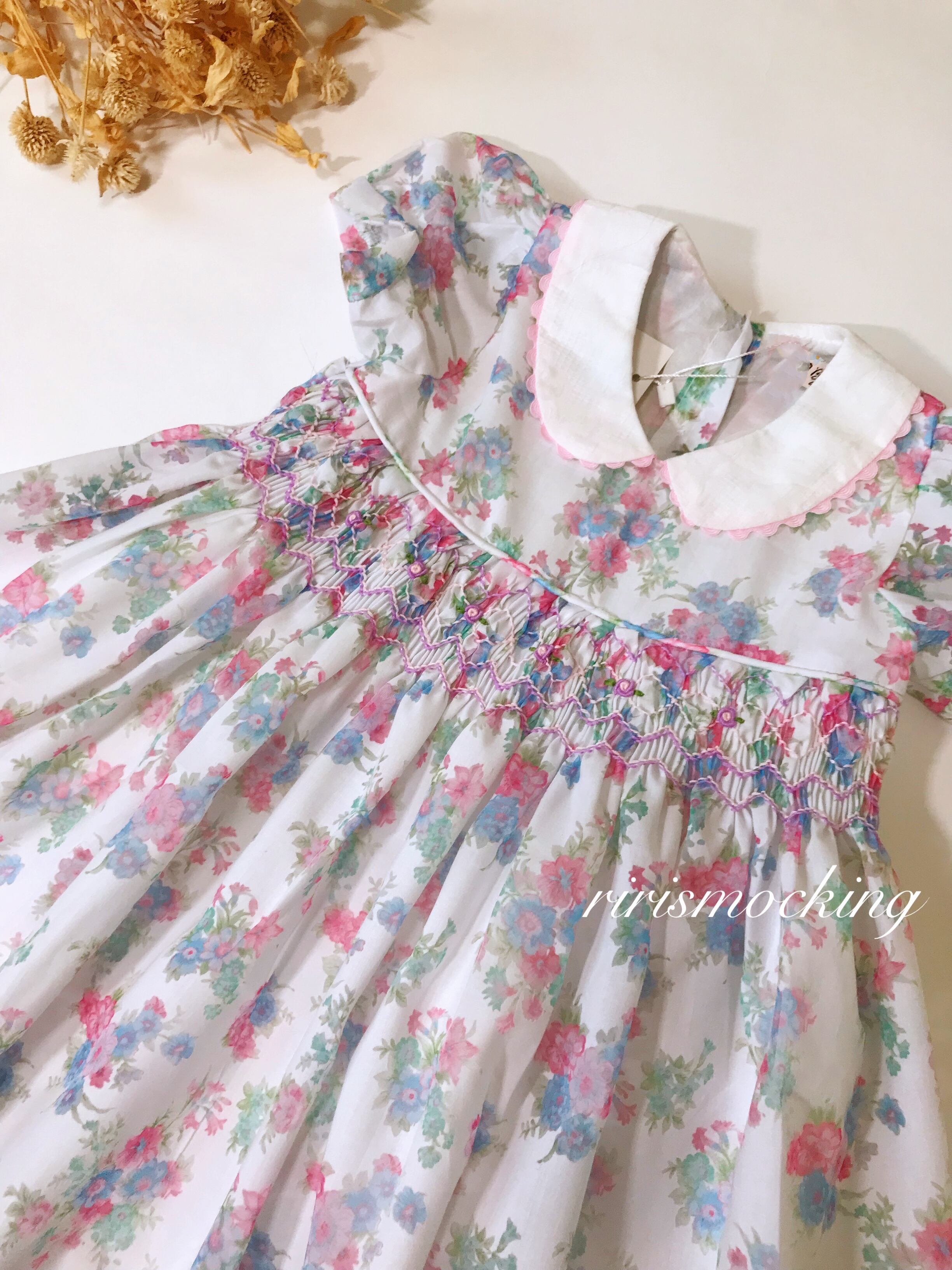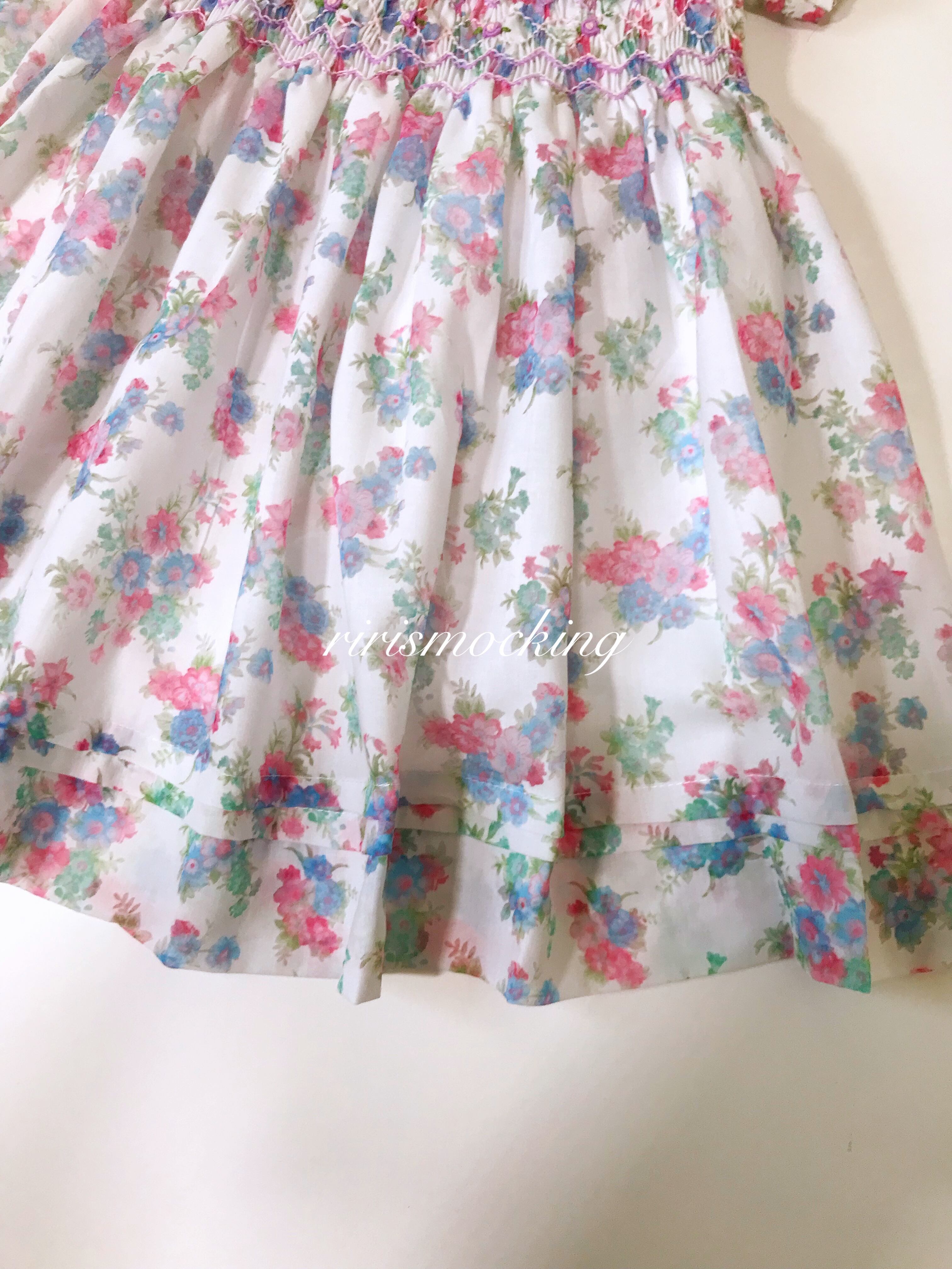 新品 ピンク ブルー 小花柄 半袖 スモッキング ワンピース