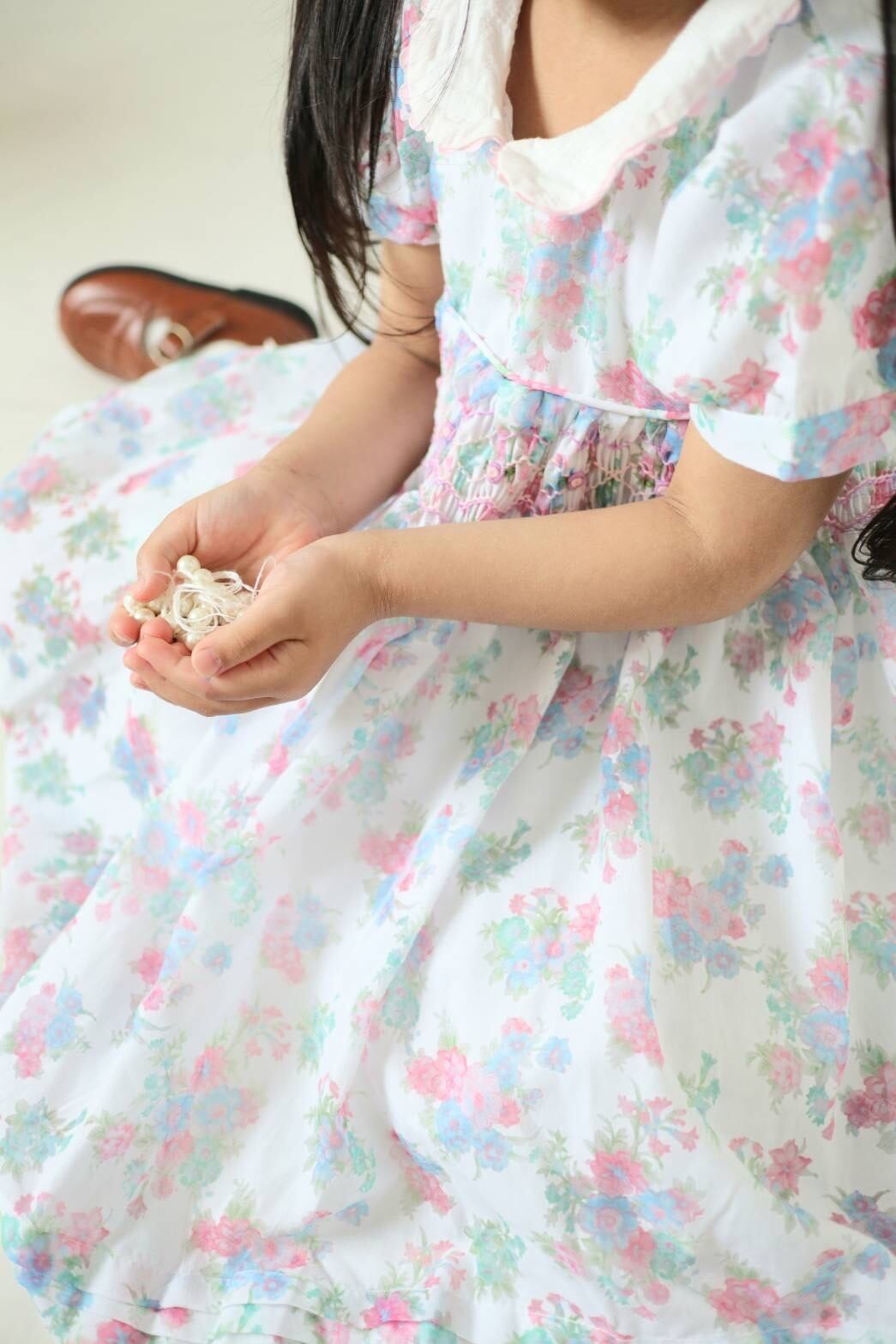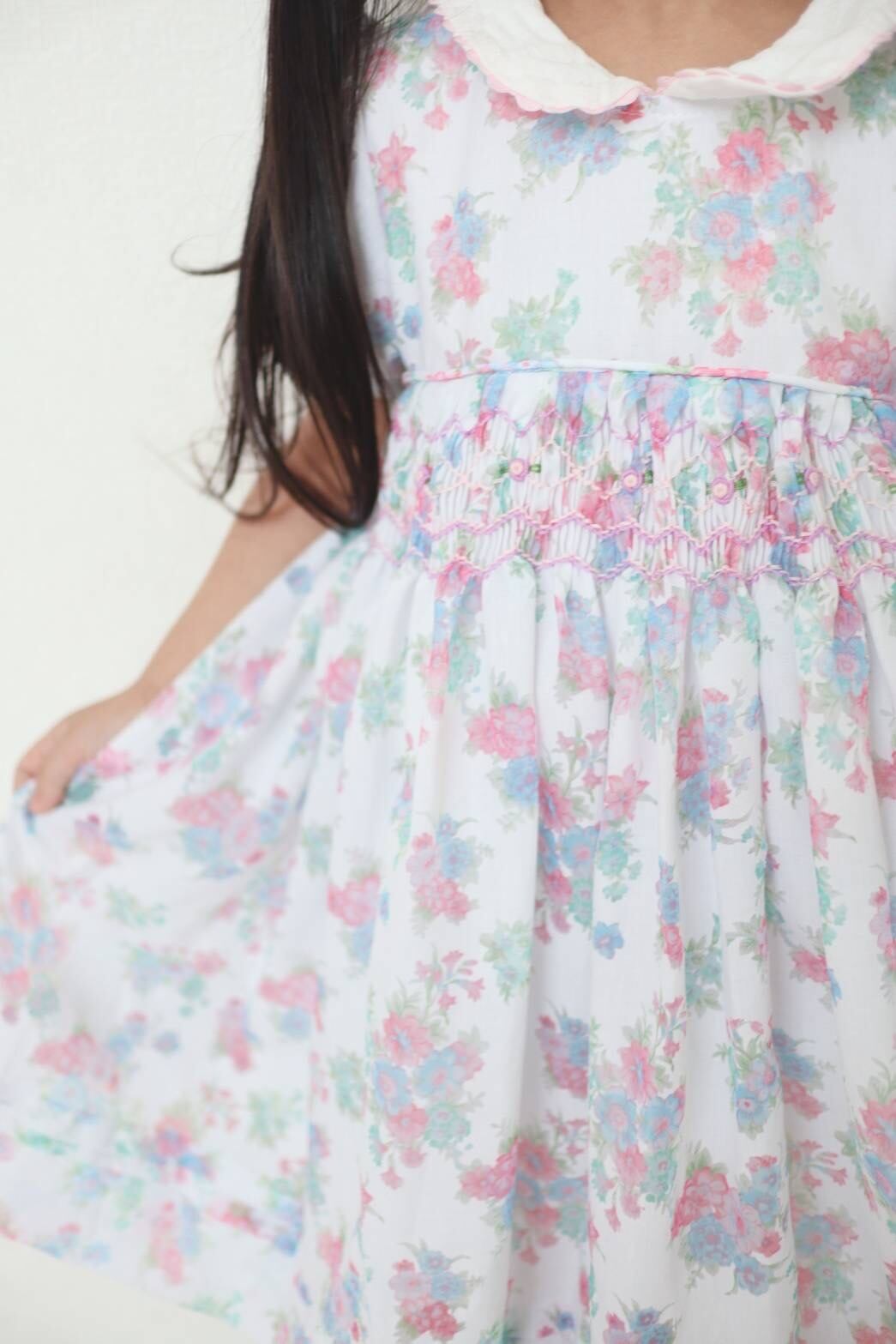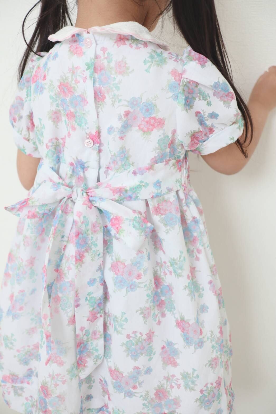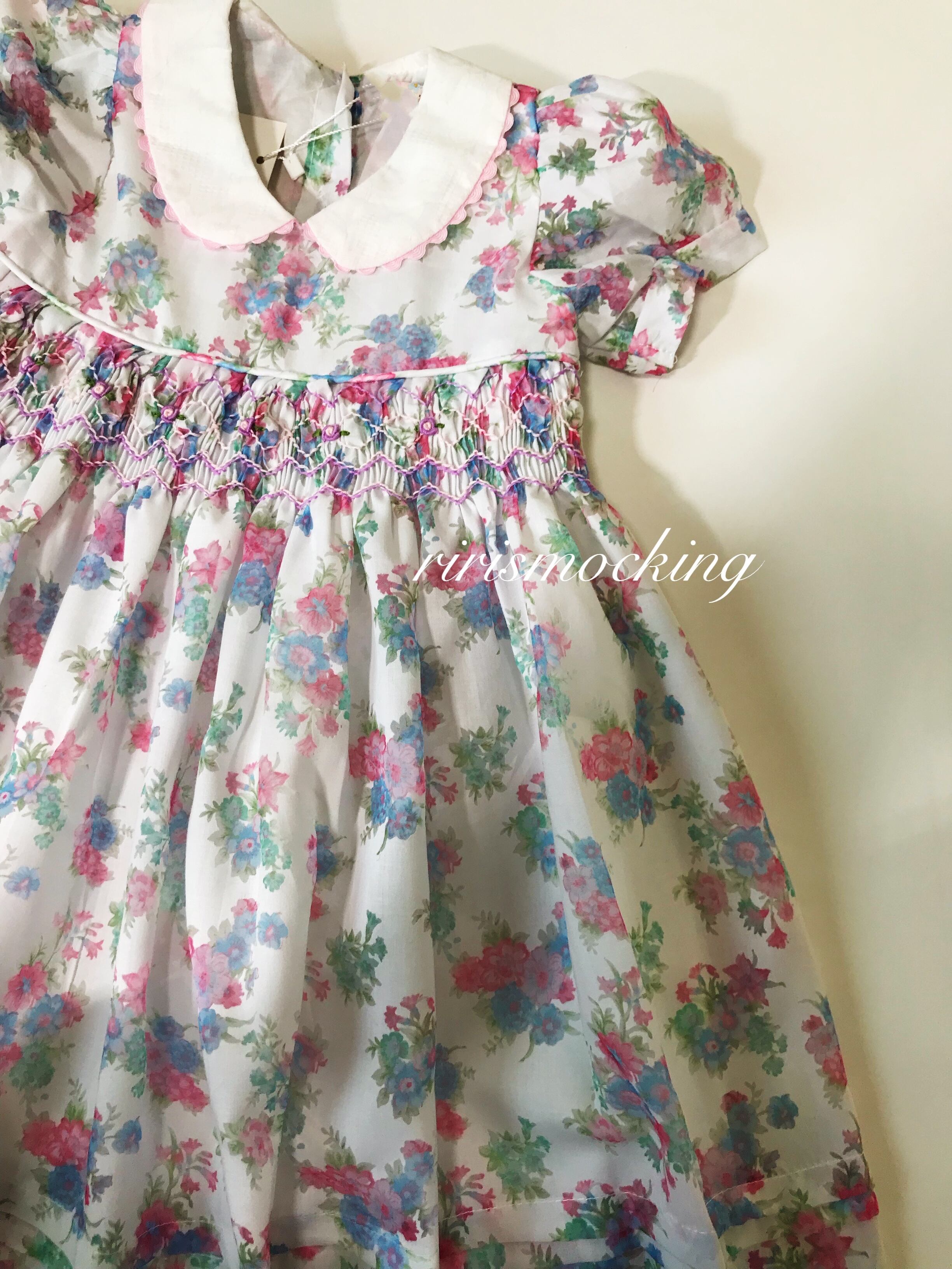 新品 ピンク ブルー 小花柄 半袖 スモッキング ワンピース