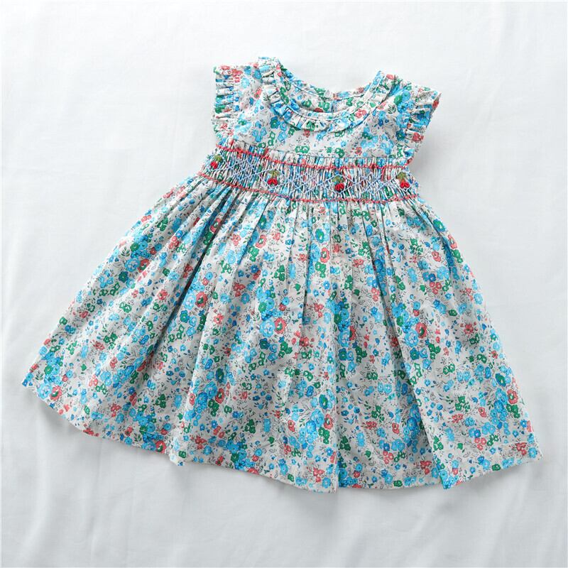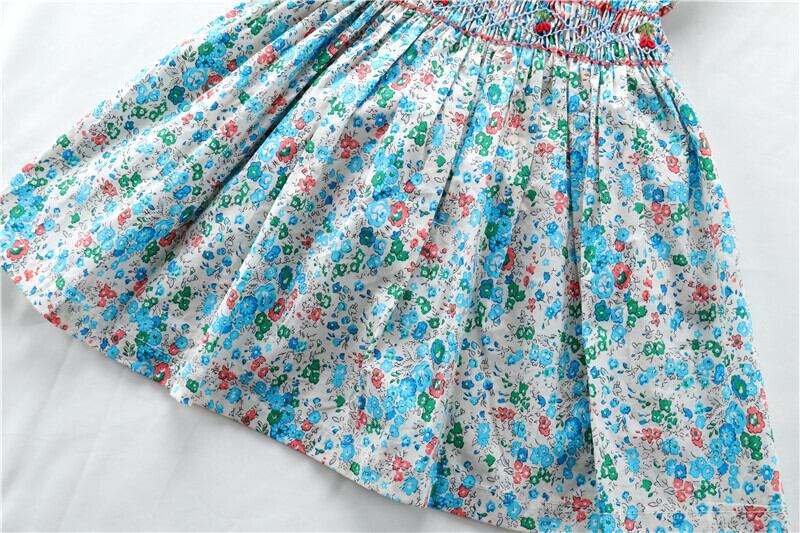新品 水色 小花柄 スモッキング ワンピース