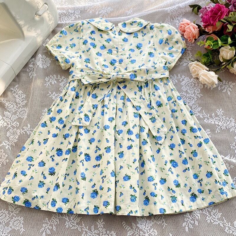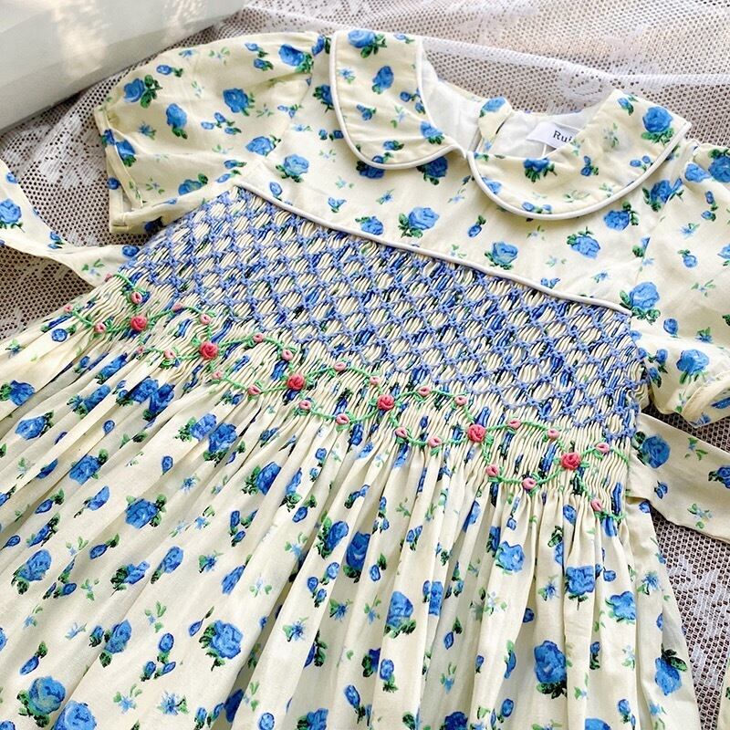 新品 半袖 ブルー 薔薇柄 贅沢スモッキング ワンピース