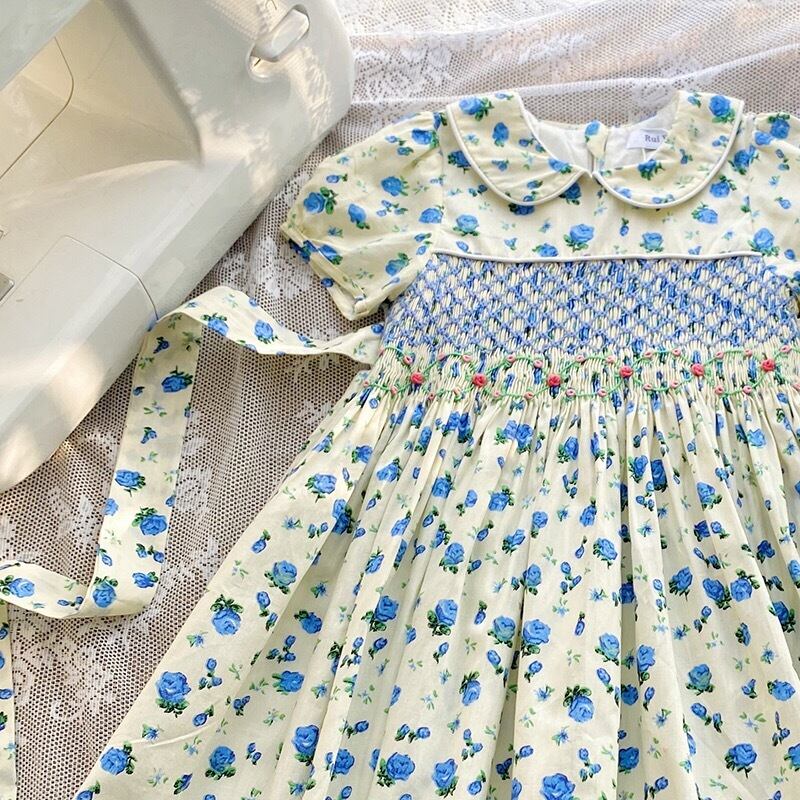 【即納】(95〜150cm)新品 ブルー薔薇 贅沢 スモッキング ワンピース