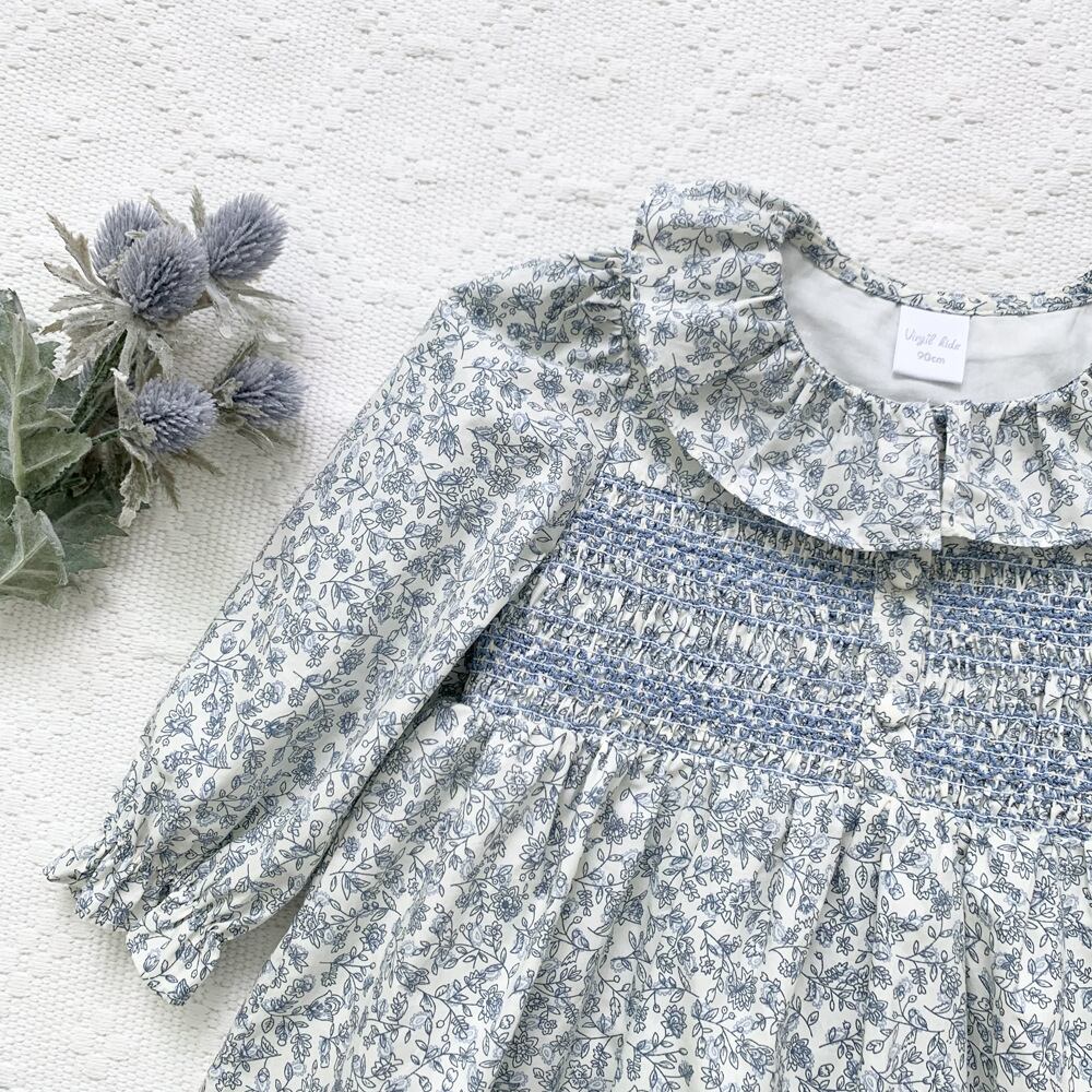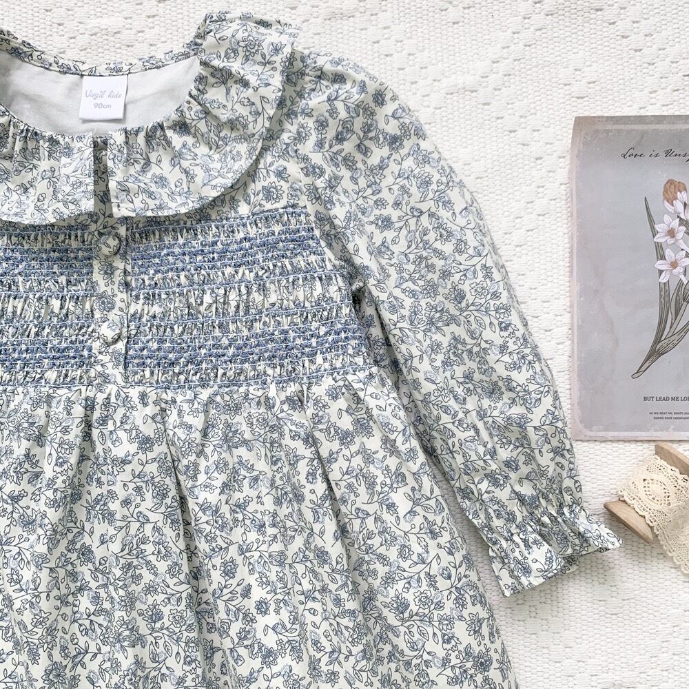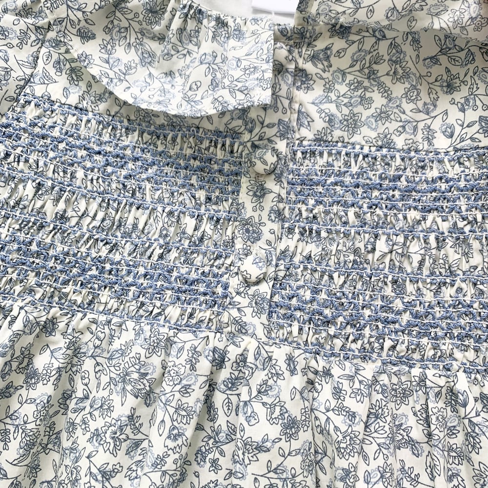 新品 水色 小花柄 襟フリル 前ボタン シャーリング刺繍 ワンピース