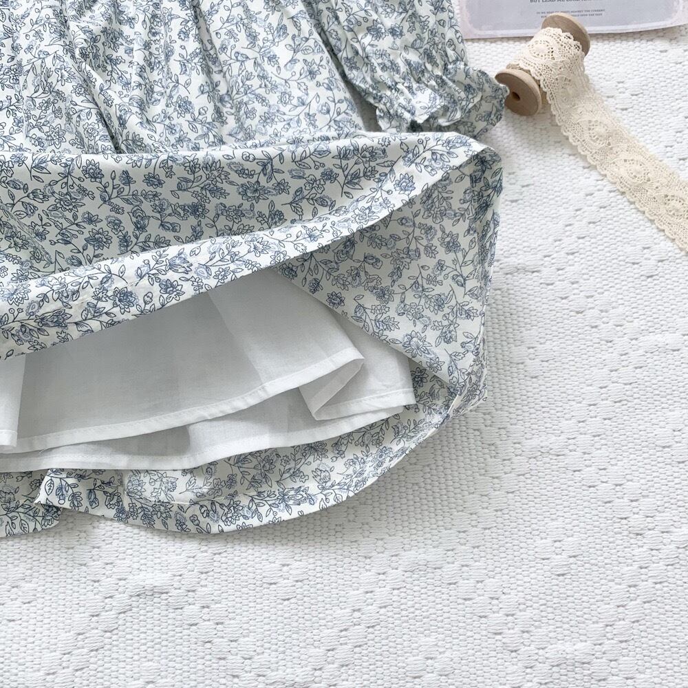 【即納】(90〜140cm)再入荷 水色 小花柄 襟フリル 前ボタン シャーリング ワンピース