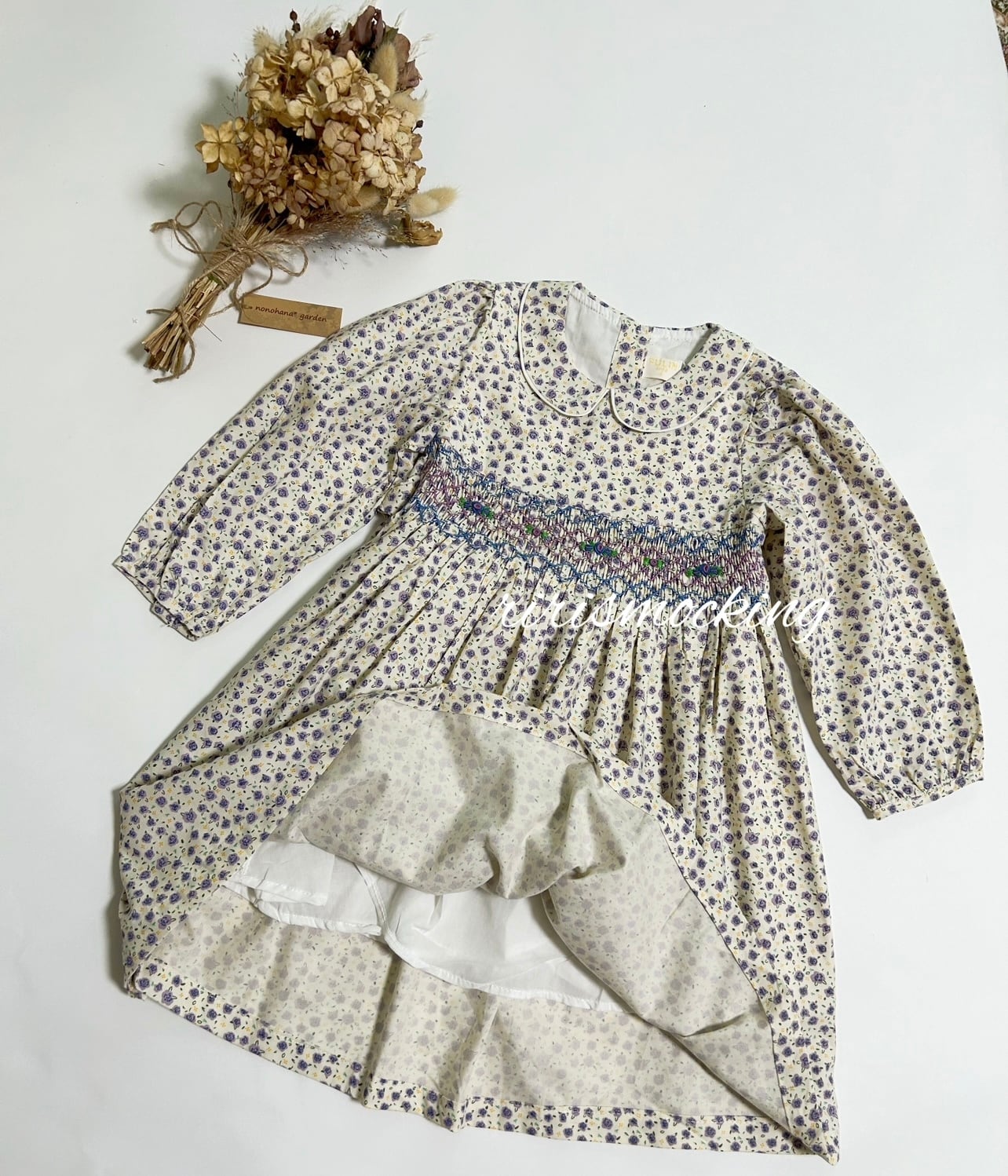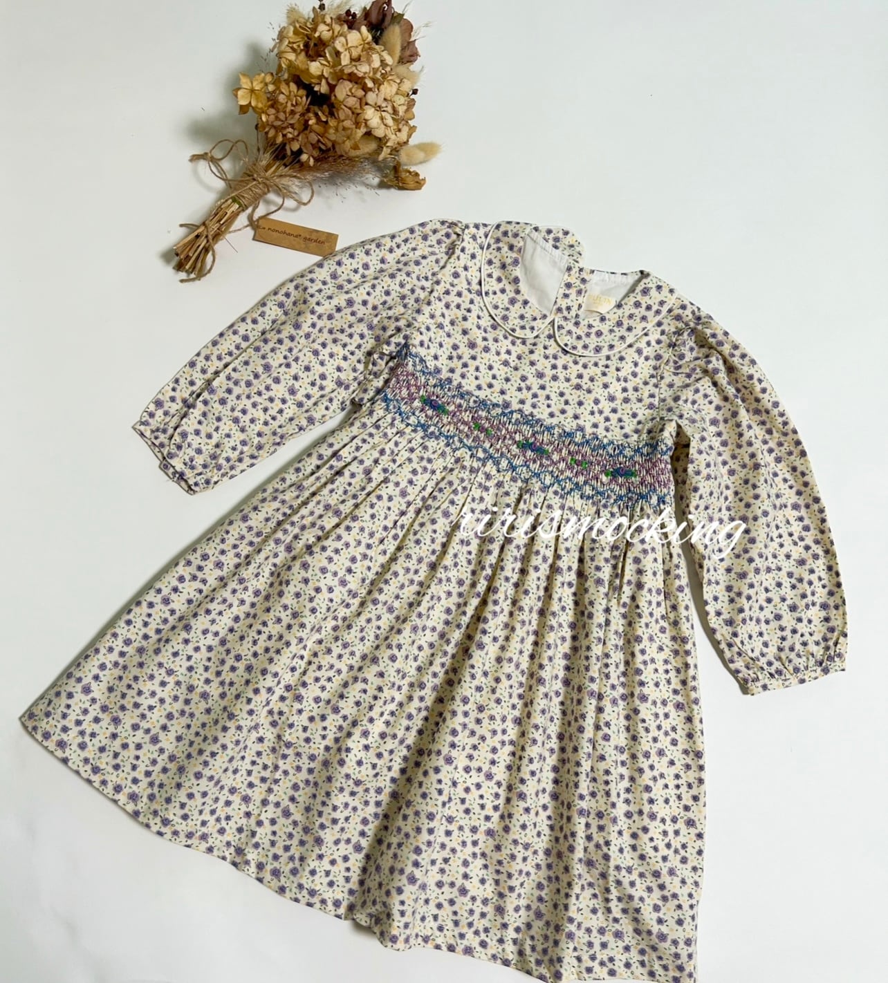 【即納】(80〜140cm)新作 紫 小花柄 スモッキング ワンピース
