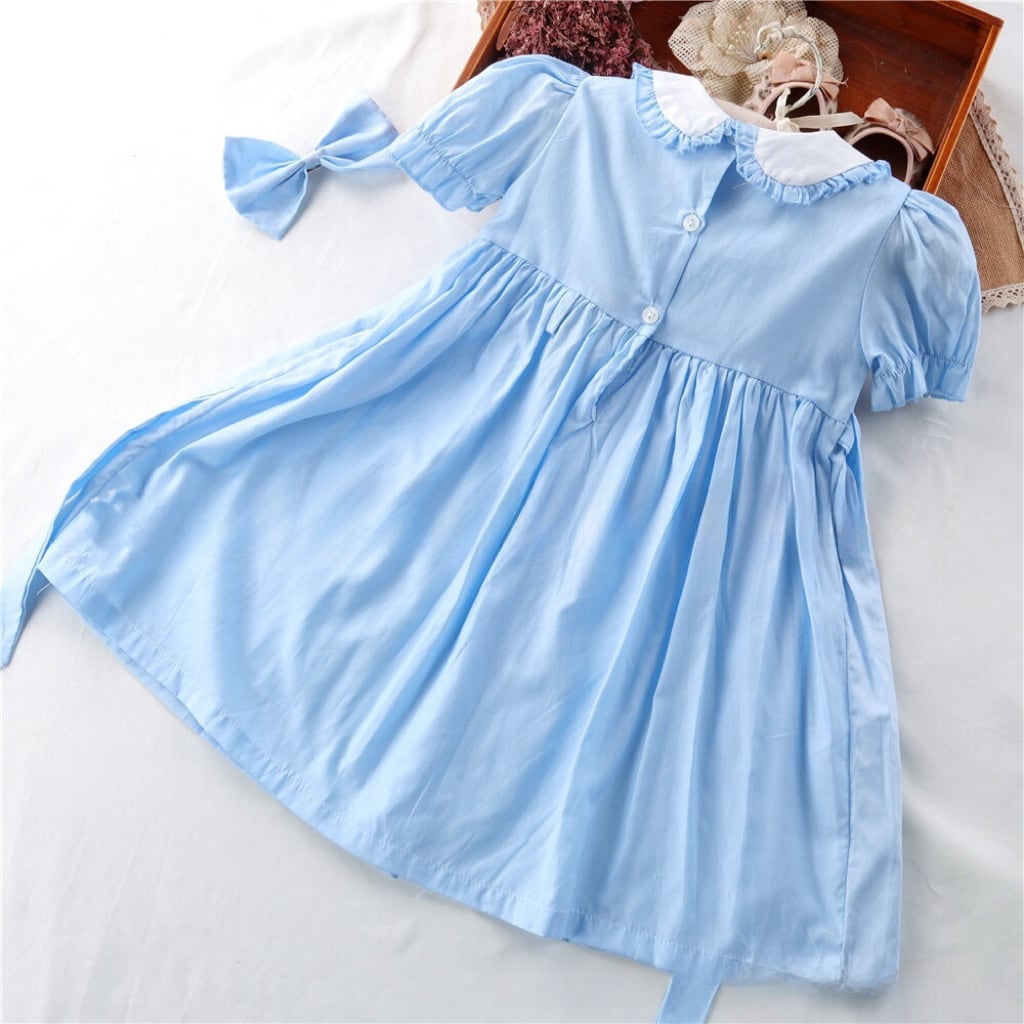 新品 襟付き 半袖 水色 スモッキング ワンピース リボン付き