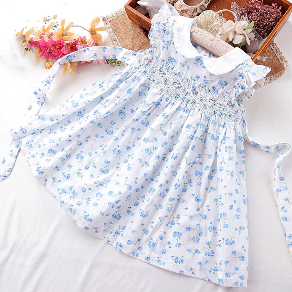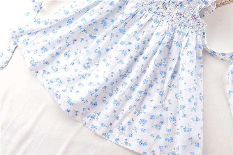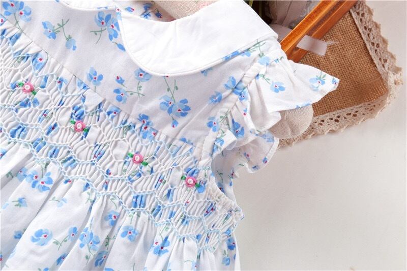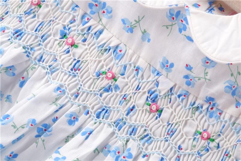 【即納】(95〜130cm)水色 花柄 スモッキング ワンピース
