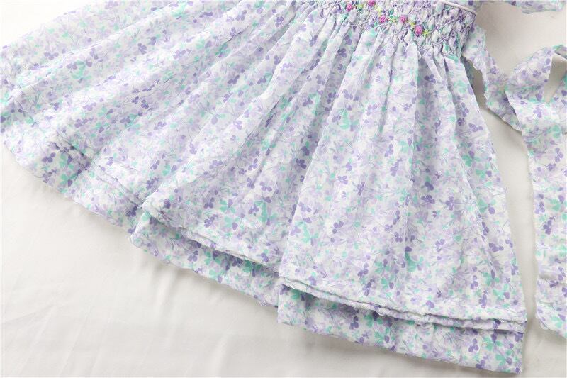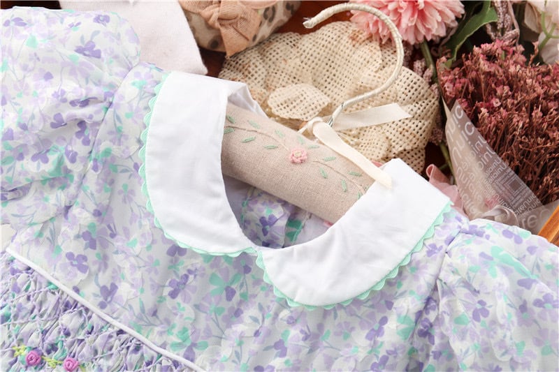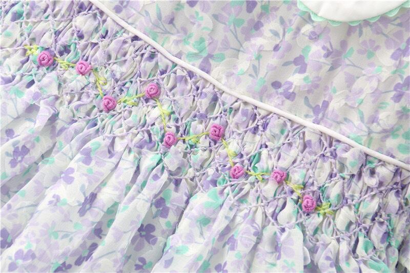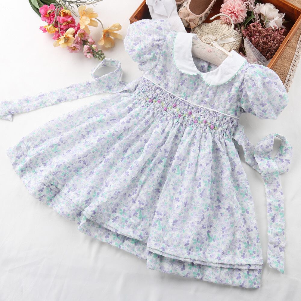 【即納】(80〜120cm) パープル 花柄 スモッキング ワンピース ドレス