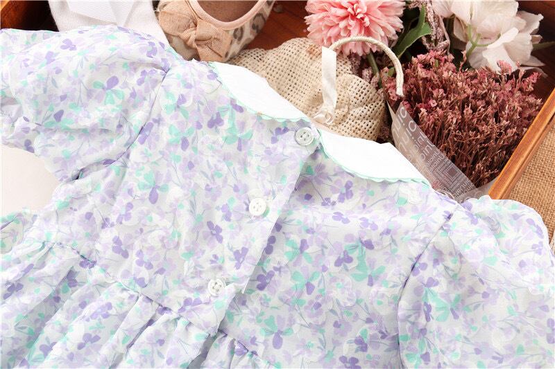 新品 パープル 花柄 半袖 スモッキング ワンピース