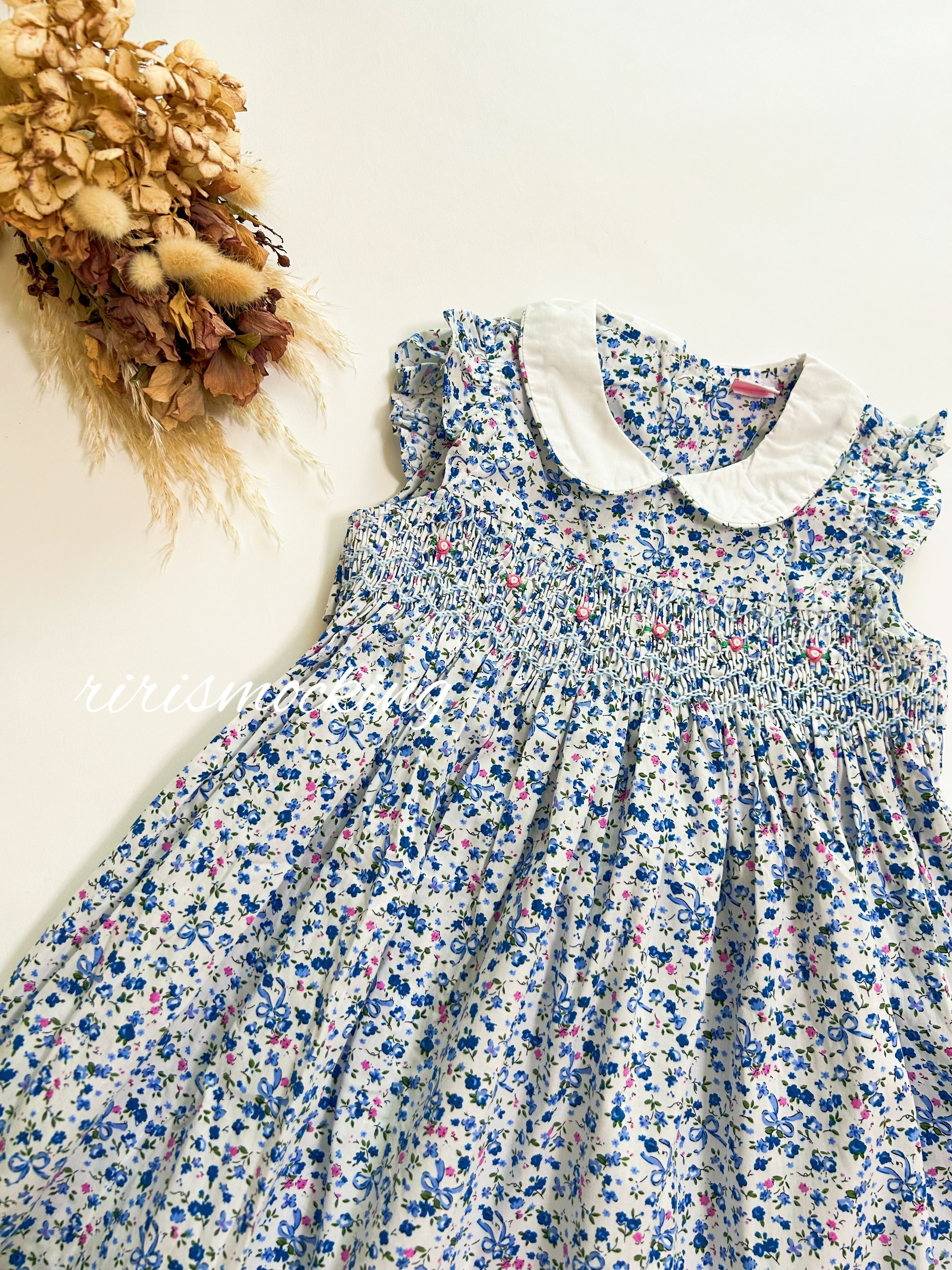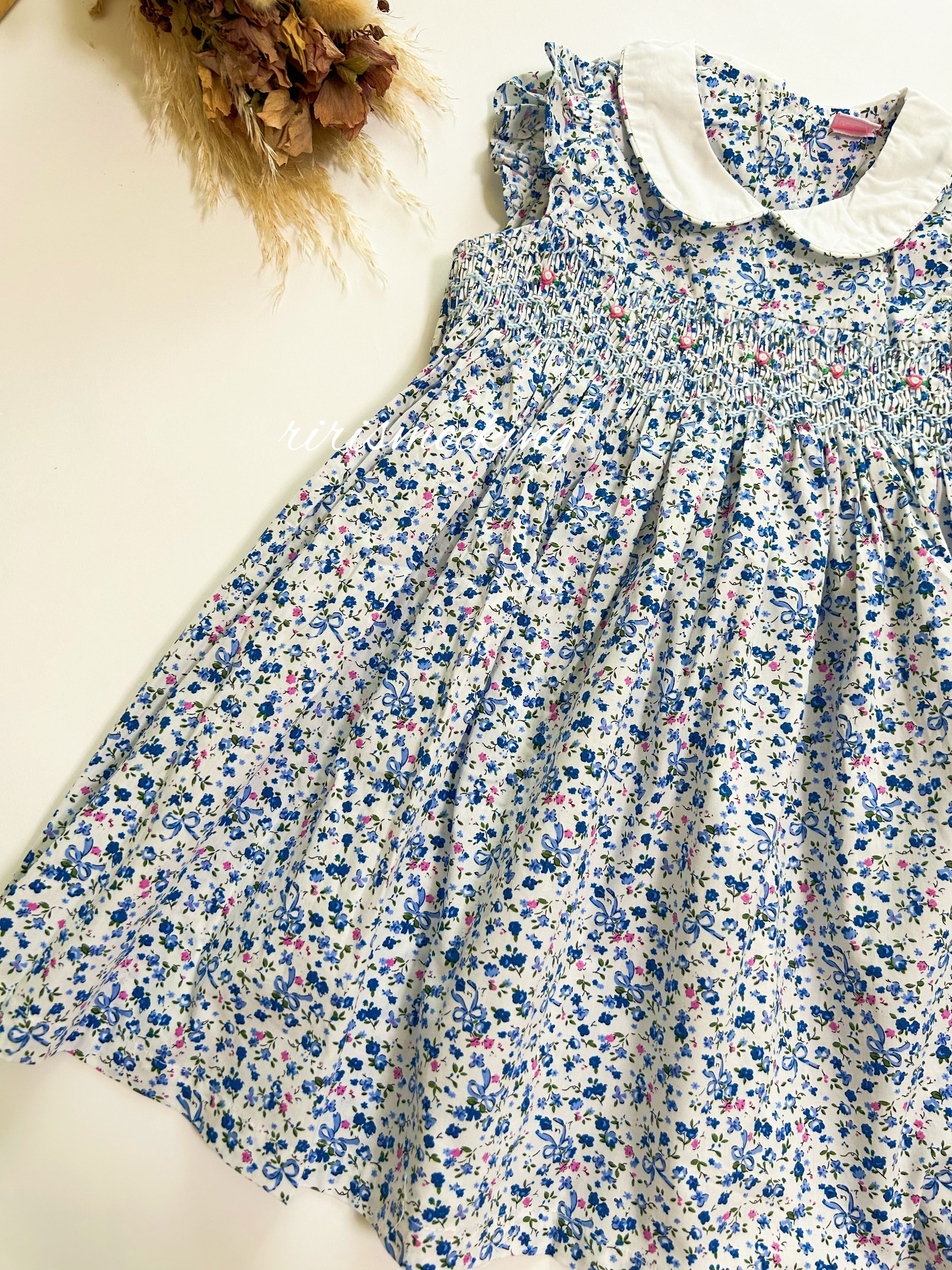 新品 襟付き 水色 花柄 スモッキング ワンピース