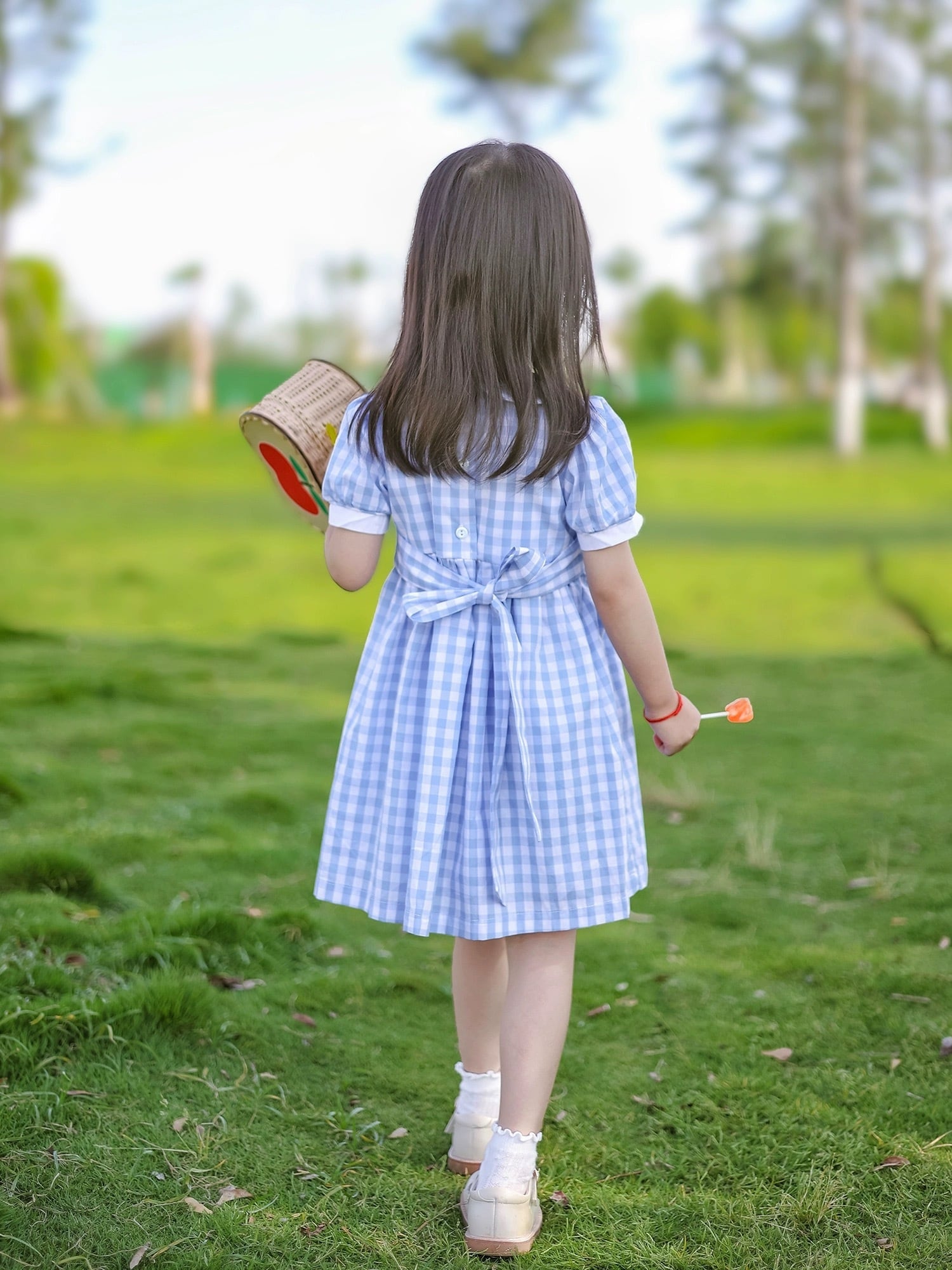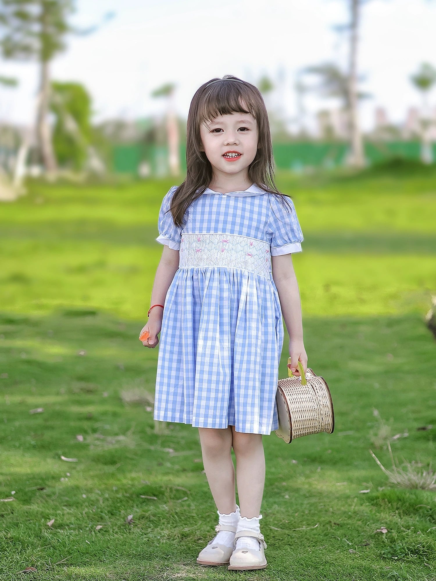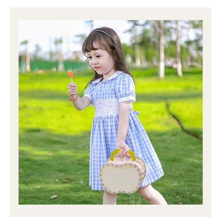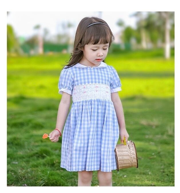 新品 ブルー チェック 半袖 スモッキング ワンピース
