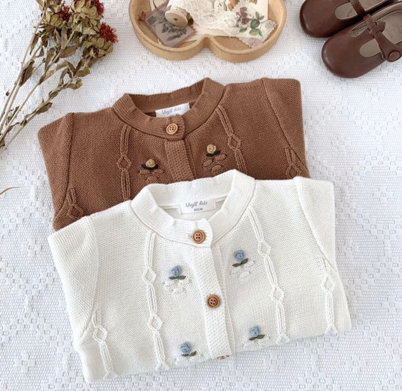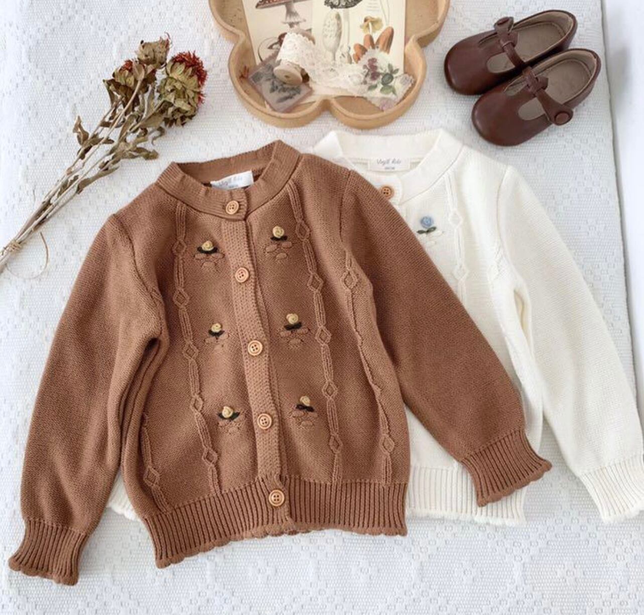 新品 ブラウン ホワイト 二色 刺繍 カーディガン