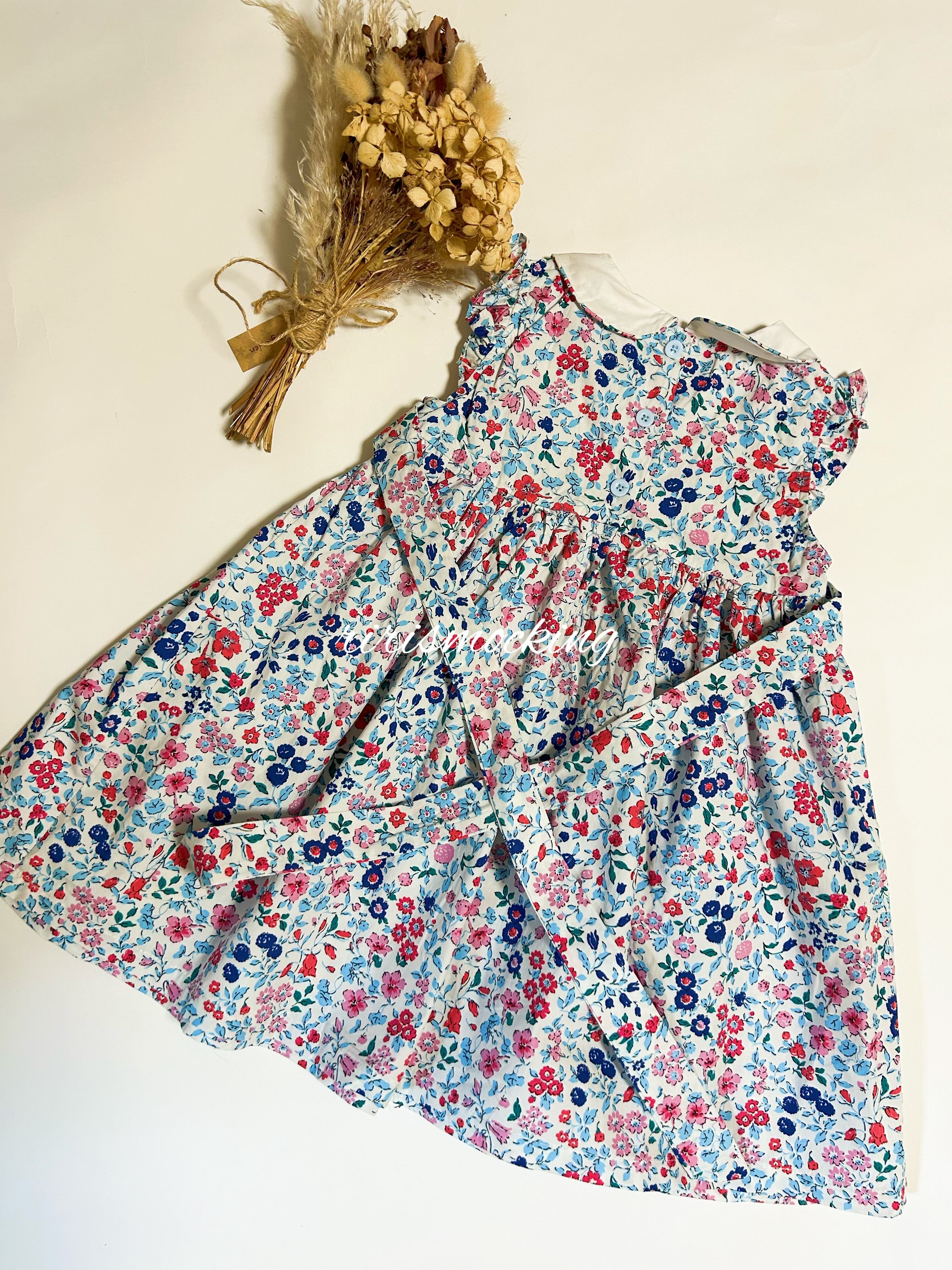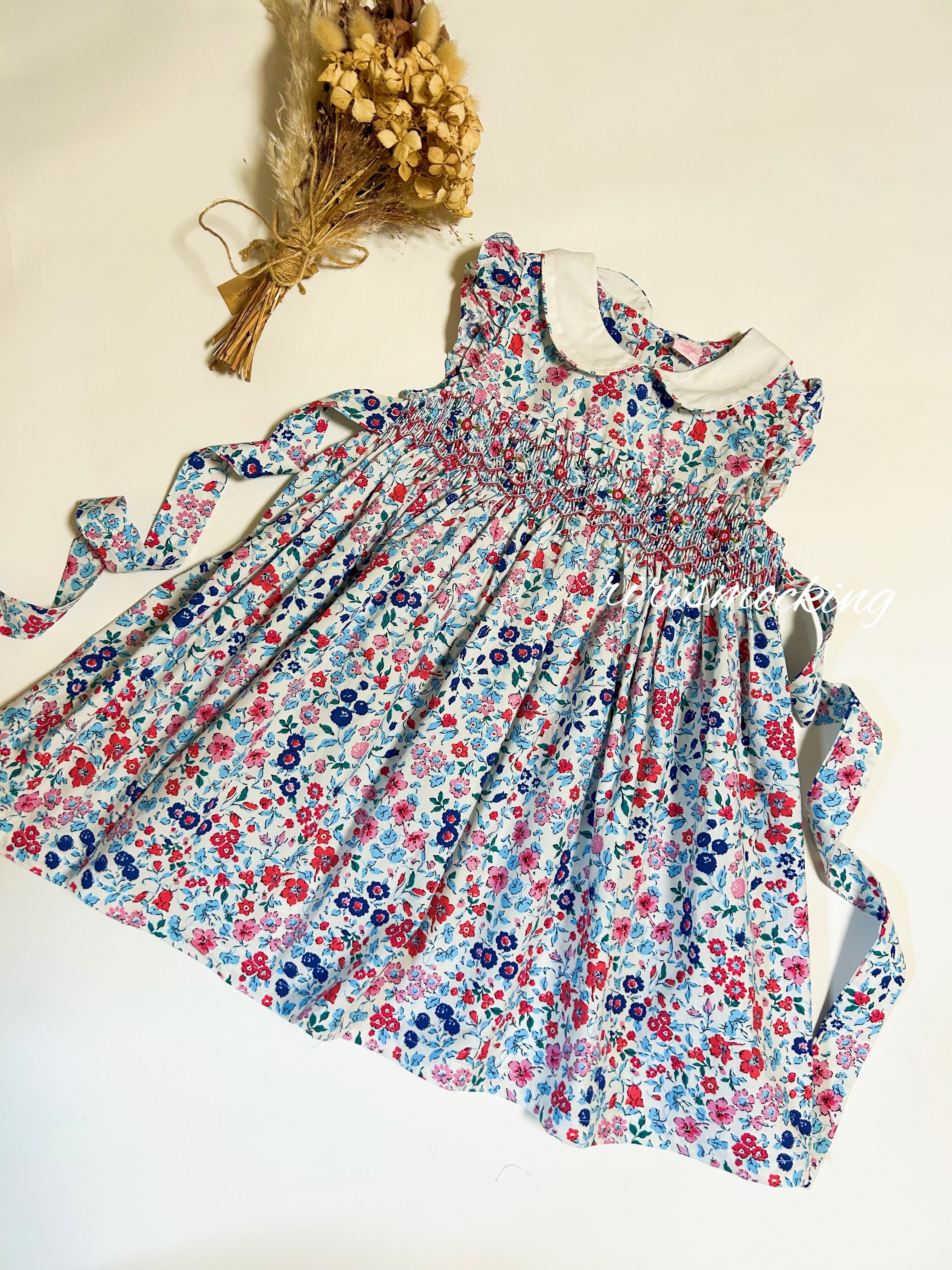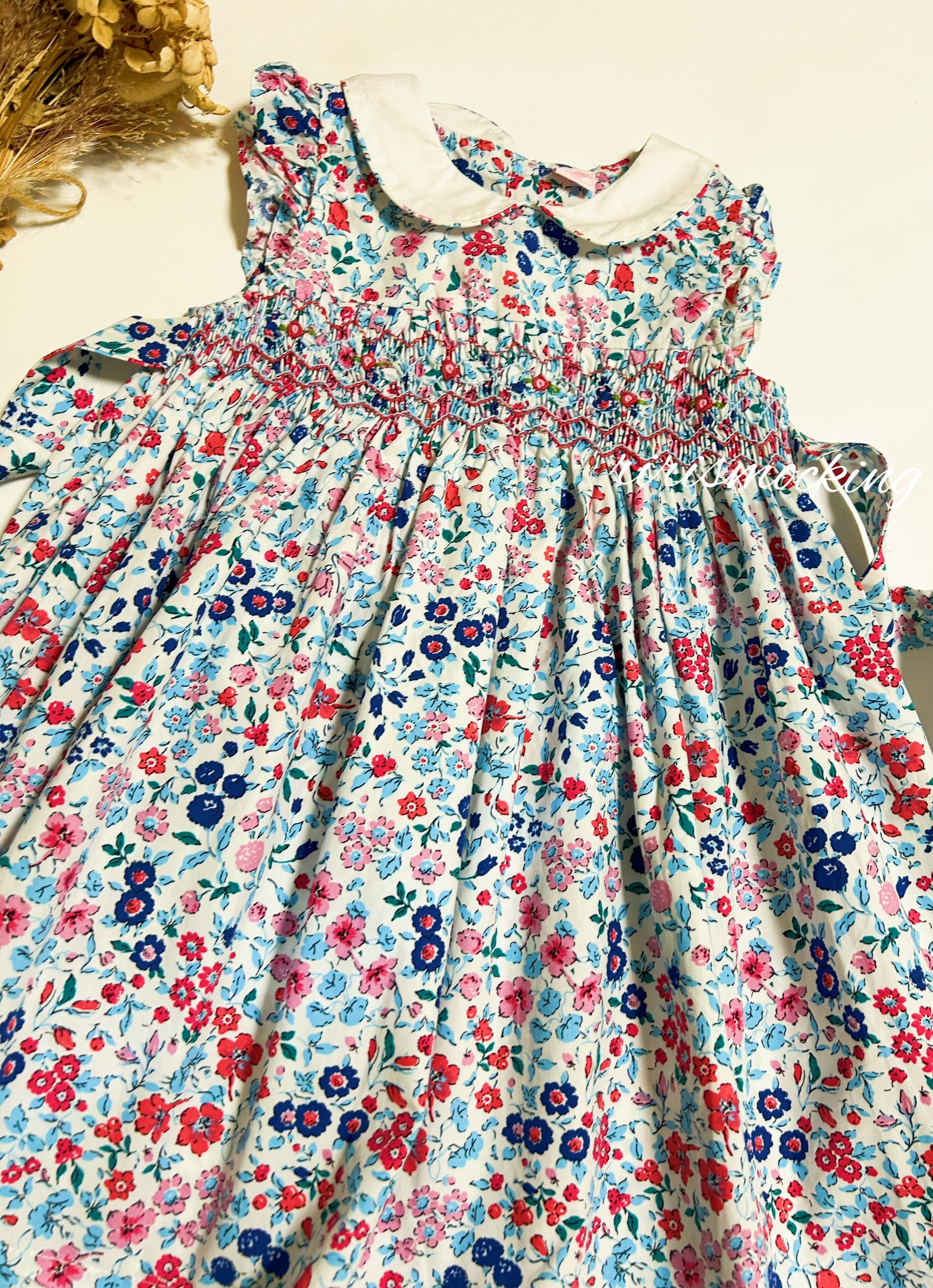 【即納】(95〜140cm)新作 赤ブルー 花柄スモッキング ワンピース