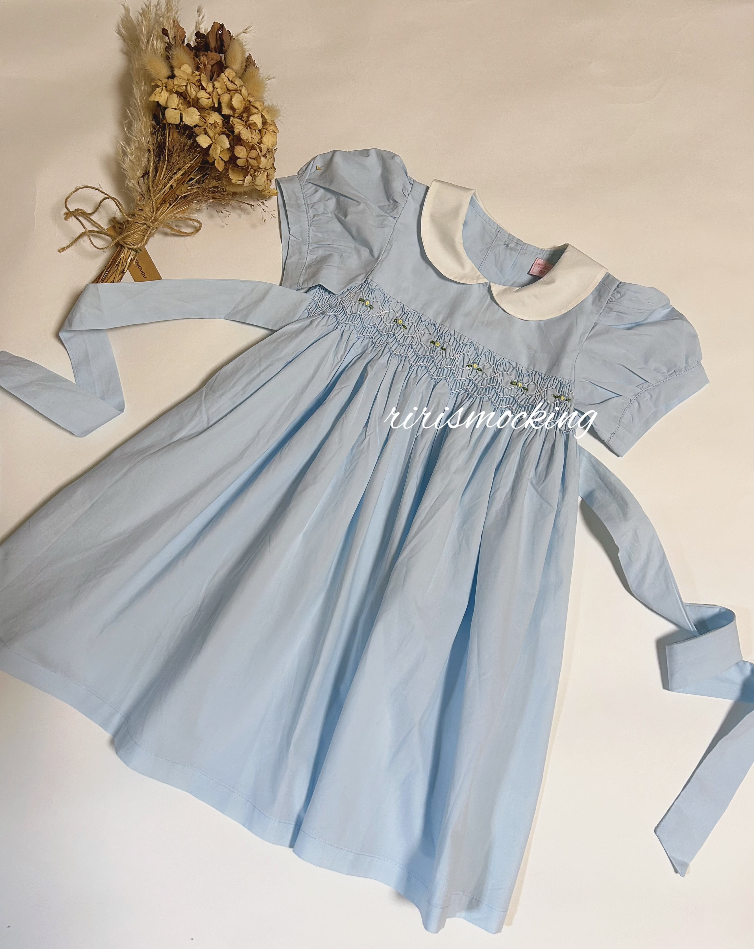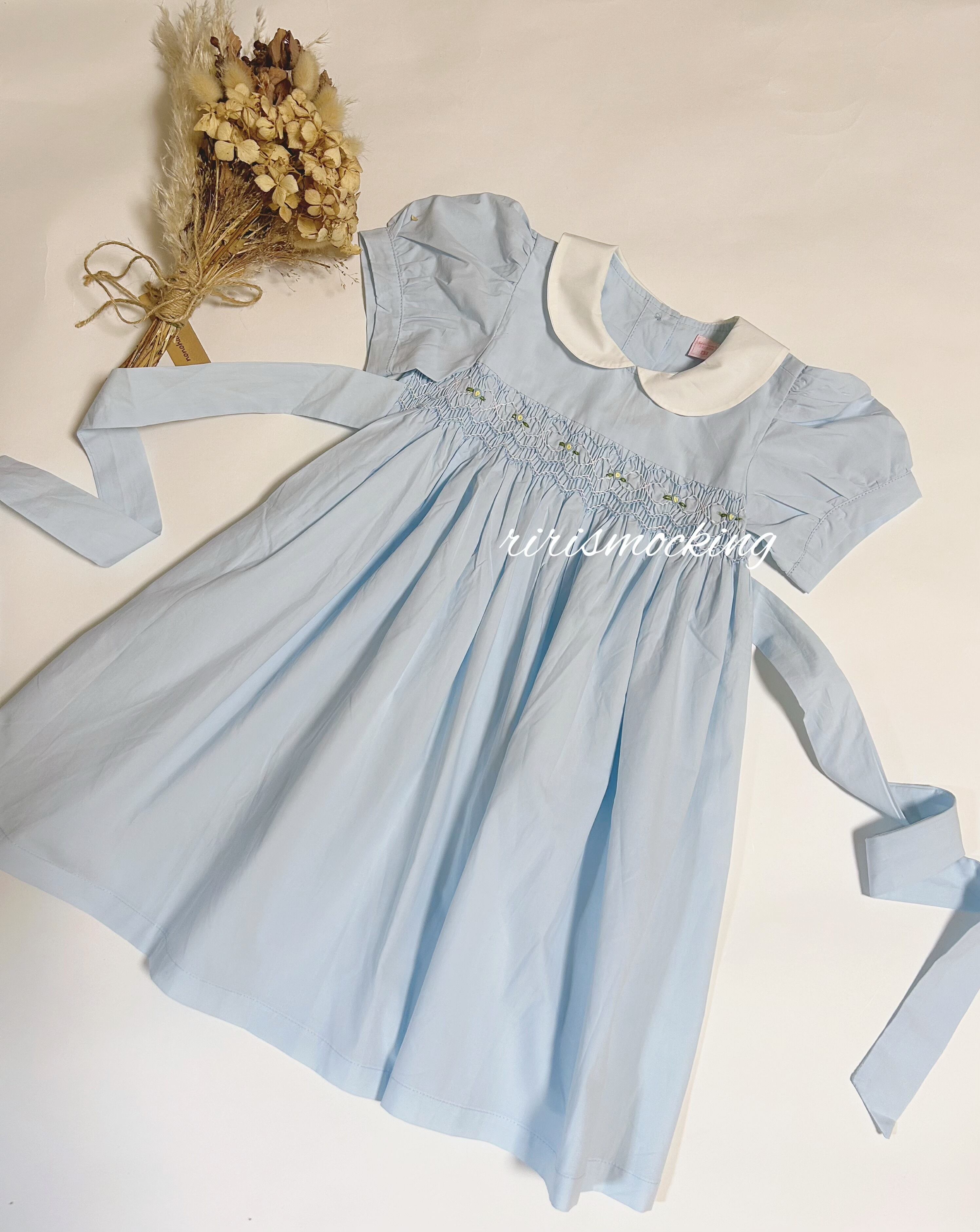 新品 襟付き 半袖 水色 スモッキング ワンピース